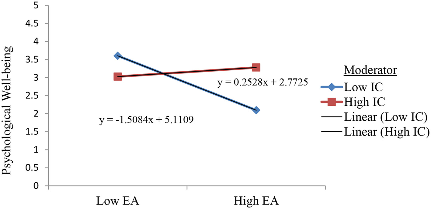 A conditional process analysis using Model 1 of PROCESS (Hayes, 2022) was done to test the moderating effect of identity commitment in the relationship between emotional autonomy and the psychological wellbeing of Filipino middle and late adolescents. Table 3 shows that the overall model fit is significant which means that identity commitment has moderating effects on emotional autonomy and psychological wellbeing [F(3, 450) = 18.98, p < 0.0000, r2 = 0.112)]. This means that the effect of emotional autonomy on psychological wellbeing can depend on the level of identity commitment.