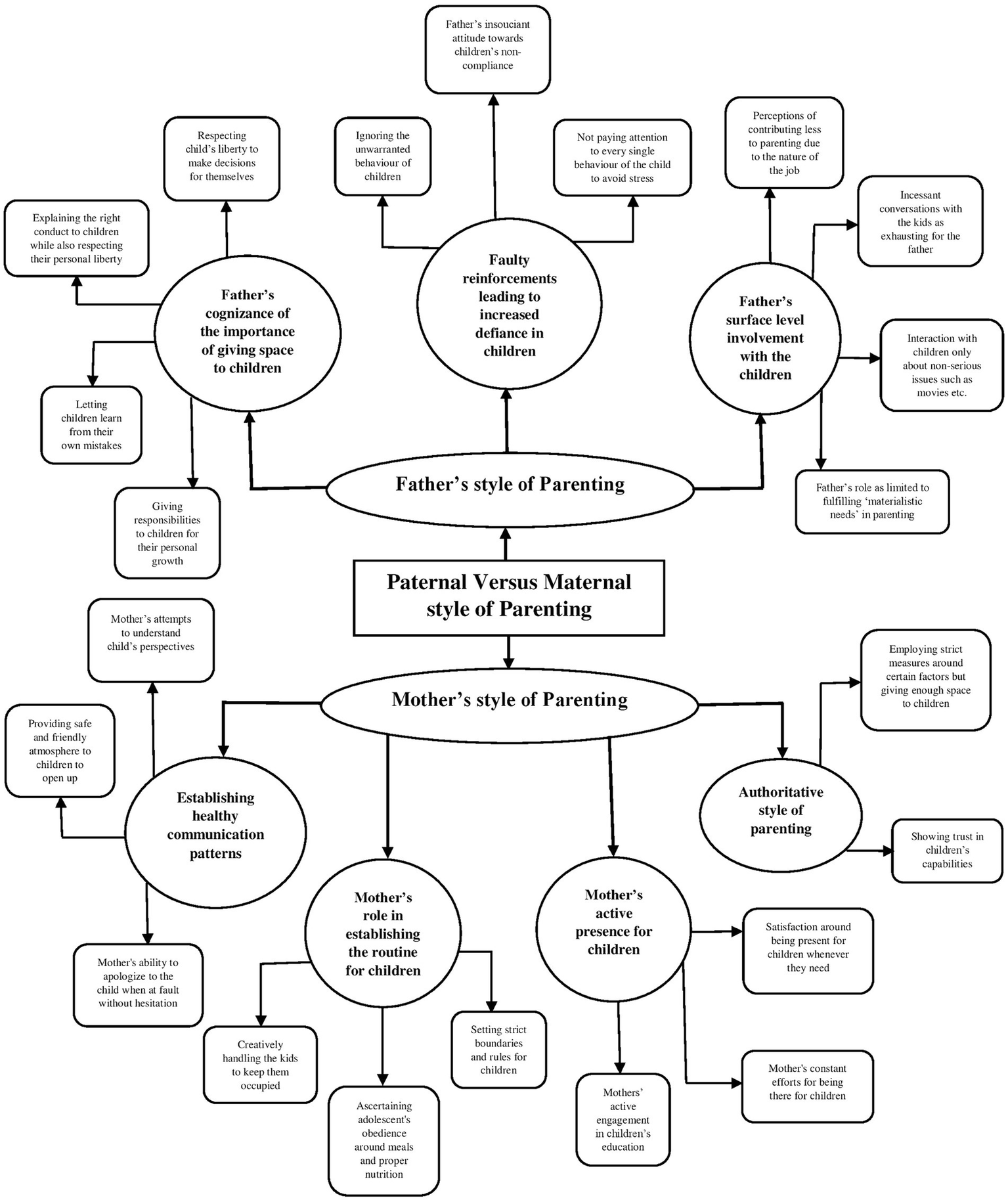 The second global theme is concerned with delineating the differences between the father’s and mother’s style of parenting in raising their children. The theme indicated that whereas fathers had a surface level engagement with children owing to the time constraints, mothers played a more active role in raising children, which was acknowledged by fathers as well. As one of the female participants, i.e., mother, was quoted as saying: