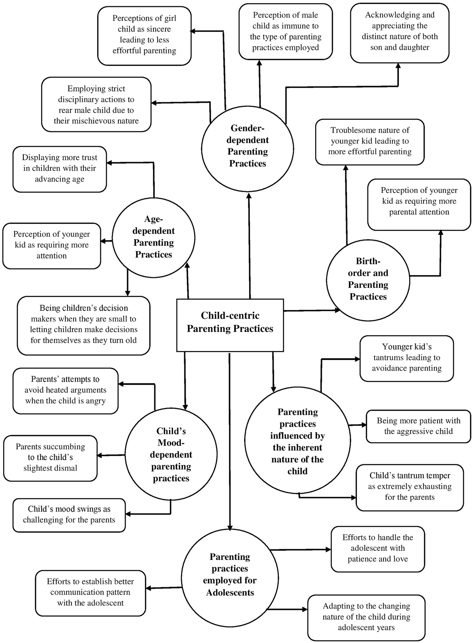 The fourth global theme outlined the type of parenting that is centred around prioritizing the needs and interests of the child and changing the parenting style depending upon the factors inherent to the child. Some of the organizing themes under this global theme were- age-dependent parenting practices, gender-dependent parenting practices, birth-order and parenting practices, parenting practices influenced by the inherent nature of the child, etc. The child-centric parenting becomes evident in the following verbatims: