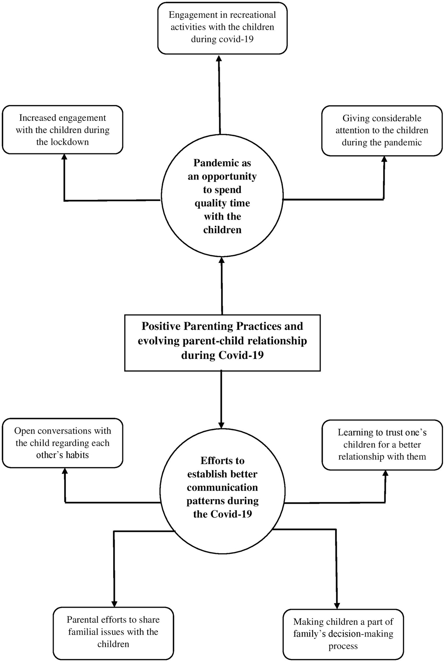 Results: Five global themes emerged from the data, namely, change in parenting style due to stressors, paternal versus maternal style of parenting, intergenerational transmission of parenting practices, child-centric parenting practices, positive parenting practices and evolving parent–child relationship during COVID-19.