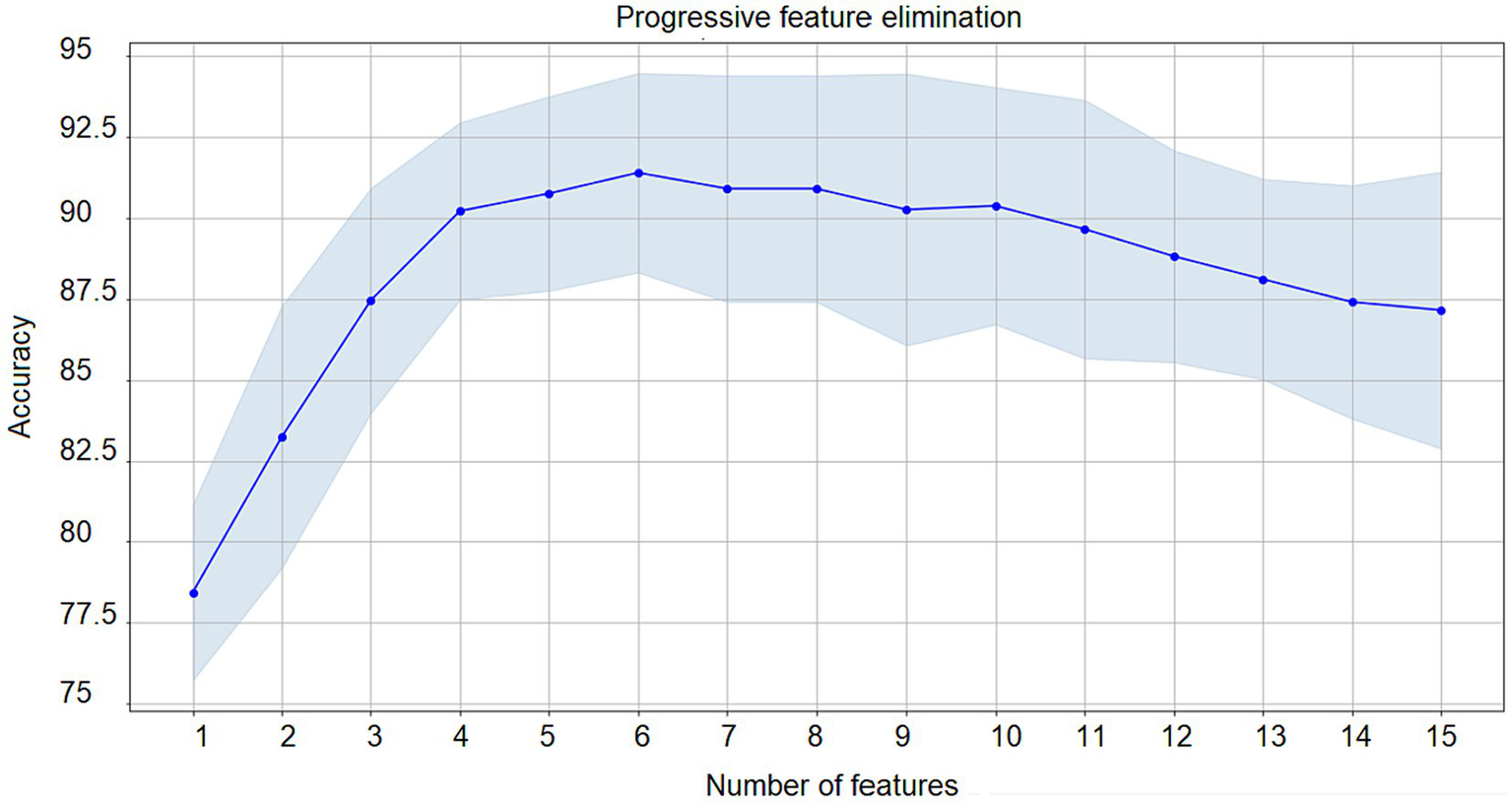 Progressive feature elimination. Progressive feature elimination. Iterative feature selection results starting from the full-set of features until an optimum number is obtained based on validation accuracy. For N = 5 the maximum accuracy (91.36%) was achieved with years of study, control of thoughts, perceived stress, impulsivity, self-esteem, and loneliness as the optimum feature set. Validation accuracy across folds (blue) and confidence interval (light blue).