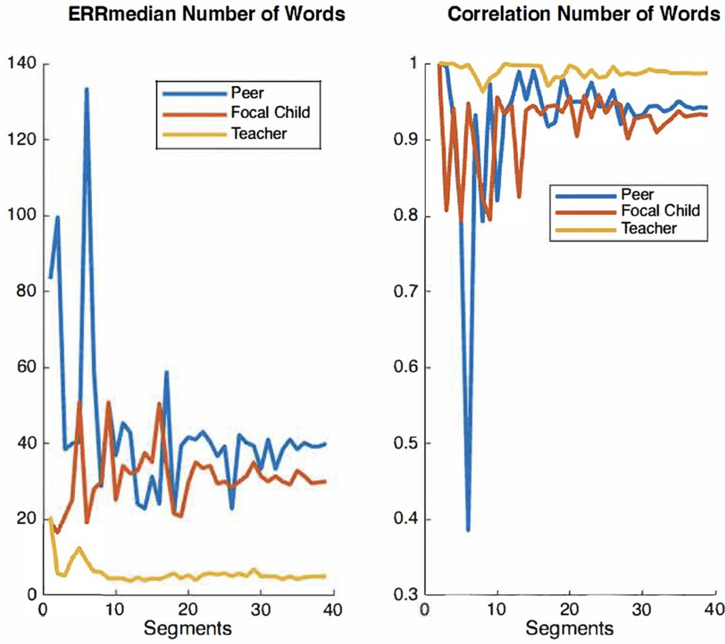 Two metrics were calculated on each of these six-minute segments by comparing correlation coefficients and ERRmedian for IDEAS relative to ground truth across the following three constructs: (a) teacher talk to children, (b) peer talk to children, and (c) children's own talk. Thus across each of the three constructs, for a given language index X , we collect the vectors Xp = [Xp, 1, …, Xp, n] and Xr = [Xr, 1, …, Xr, n], where Xr, j and Xp, j are the ground truth (reference) and predicted measures for segment j . We compute the linear correlation (R) between Xp and Xr, and the ERRmedian across segments for each speaker type across the thirteen indices.