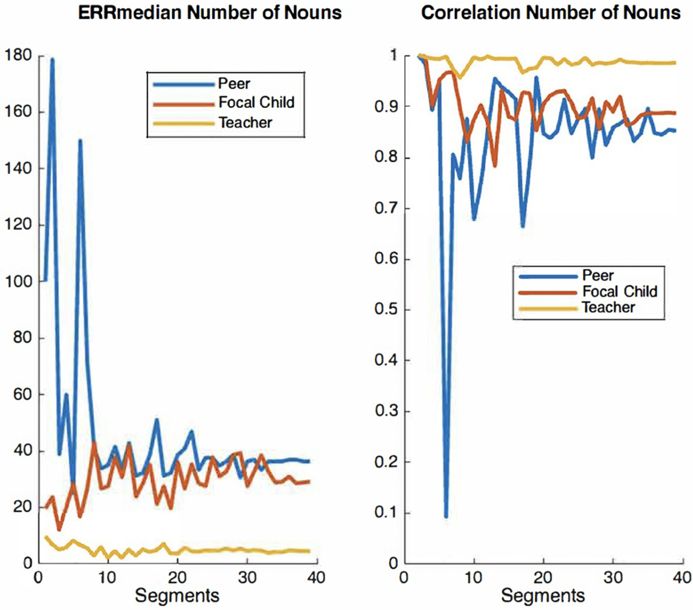 For the present study, we elected to use the audio recordings of six children, which were manually timestamped and transcribed by trained observers for the purpose of examining IDEAS accuracy (Chaparro-Moreno et al., 2019). The segments were non-concurrent recordings randomly selected from 1 h recording sessions collected in the mornings over a two-week period. Our rationale for selecting six children was twofold. First, using the recordings of these six children allow for a larger corpus of peer-talk from children not wearing recorders directed to children wearing recorders. Second, there are extensive resource demands associated with timestamping and transcribing recordings using the conventions overviewed below. The time cost of manually timestamping and transcribing 10 min of child-speech audio is ~5 h. We therefore examined convergence plots for both ERRmedian and correlation values across audio segments to ensure ample data are used for the analyses of system accuracy. Convergence plots are used to determine whether there is sufficient quantity of a given measure to evaluate its accuracy with precision. In a graph that displays acceptable convergence, the curve value becomes asymptomatic as its plot values increase along the x-axis. Figures 2–4 show convergence plots for number of words, number of utterances, and number of nouns. The coding team began to work with recordings of six children; the lead engineer monitored convergence. After the timestamped and transcribed recordings of six children were compared to those automatically transcribed and scored by IDEAS, curve values became sufficiently asymptomatic (non-stochastic), indicating that ample timestamped and transcribed data are used for these analyses of IDEAS system accuracy.