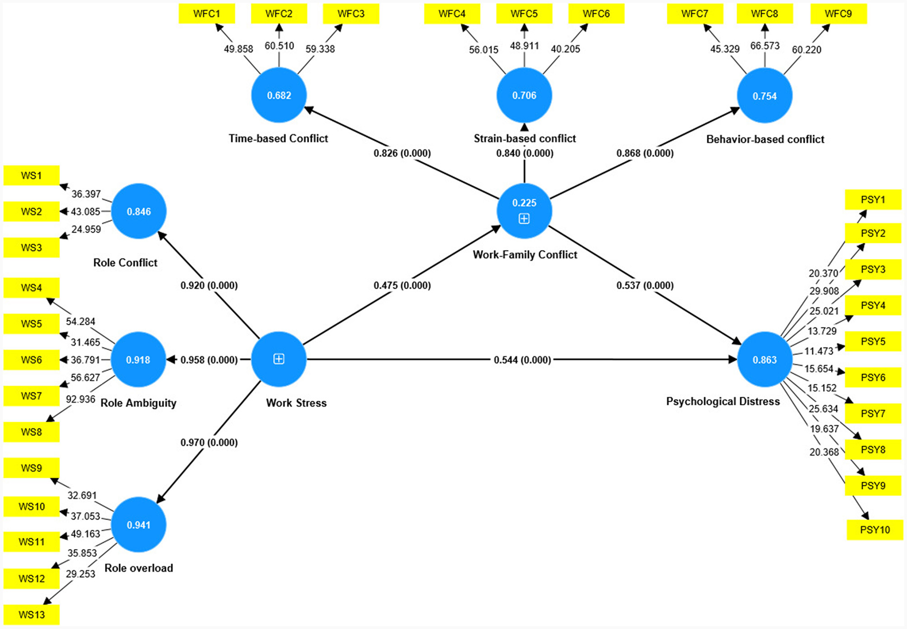 The questionnaire development involved a literature review to identify scales and items related to work-related stressors, psychological distress, and work-family conflict. A comprehensive pool of potential items for each construct was generated based on the findings. The questionnaire comprised four sections, each serving a specific purpose. Section 1 (demographic data) collected basic demographic information from the participants (i.e., gender, age….etc). Section 2 (work stress) includes role overload, role ambiguity, and role conflict. Based on Peterson et al. (1995), a 13-item scale was utilized, including three items for measuring role conflict, five for role ambiguity, and five for role overload. An example item is “There is a need to reduce some parts of my role.” Section 3 (WFC) measured participants' perceptions of work-family conflict. A 9-item scale, that includes three dimensions each comprising three items, adapted by Abdou et al. (2022) was employed to assess this construct. An illustrative item from these dimensions is “Working in resorts keeps employees from their family activities more than it should be.” Section 4 (psychological distress) aimed to explore participants' psychological distress using the well-established 10-item Kessler psychological distress scale (K10) based on the study by Andrews and Slade (2001). A sample item from this section is “In the past 30 days, how often did you feel depressed?” Responses to work stress and WFC queries were collected on a five-point Likert scale, with one corresponding to “strongly disagree” and five representing “strongly agree.” Meanwhile, the response rate regarding psychological distress was calculated using a five-point Likert scale where one means “none of the time” while five means “all of the time.” Strong internal consistency was observed for the work stress (α = 0.880), work-family conflict (α = 0.897), and psychological distress (α = 0.866) scales.