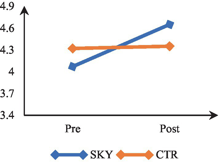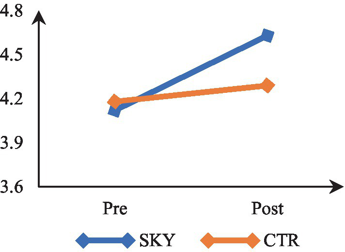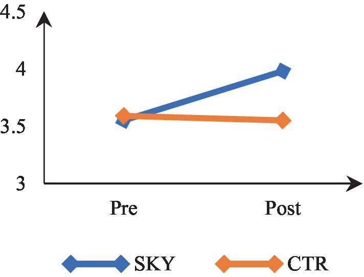 To compare the differences in variables from pre- to post-intervention among the two groups, mixed-design analysis of variance (ANOVA) was employed to assess the interaction between the two factors, i.e., across time and group (Seltman, 2012; Anderson et al., 2016). Additionally, within-group analysis was conducted via repeated-measures ANOVA to test for the main effects of time (change from pre to post) on both SKY and CTR groups. We also conducted a between-group analysis based on an independent t-test to assess the difference between the two groups. Correlation analysis among the seven study variables was also conducted. All analyses were performed using SPSS Version 27 software, with the significance level set at 95%. The effect size was estimated as partial eta squared (partial η2) for all ANOVA-based tests, while Cohen’s d was estimated for the independent t-test. As suggested by Cohen (1988), effect sizes were considered Cohen’s d = 0.20 as small, Cohen’s d = 0.50 as medium, and Cohen’s d = 0.80 as large.