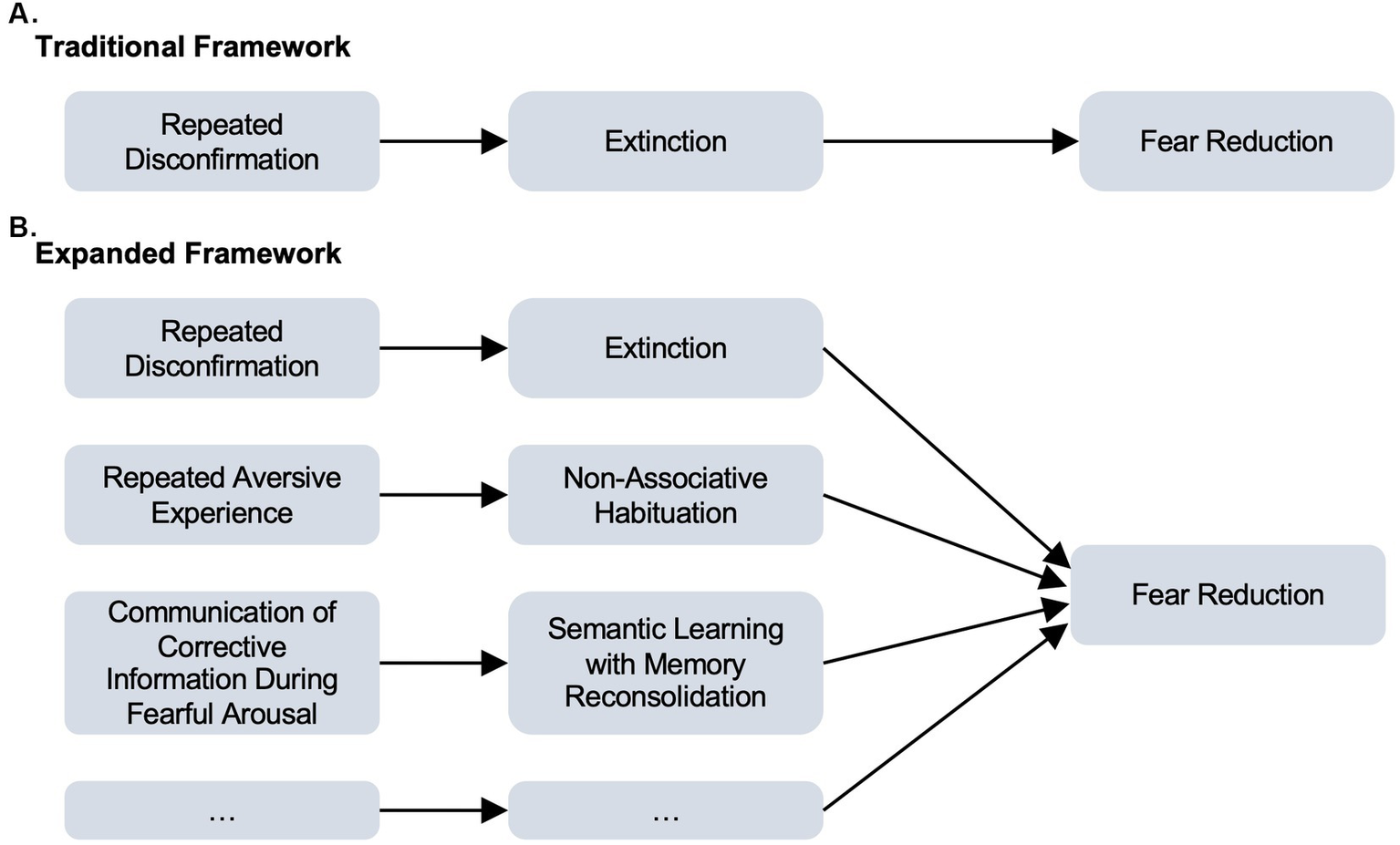 The traditional framework centers on extinction learning as a means to fear reduction. Our expanded framework includes extinction learning as one of many mechanisms by which exposure therapy can bring about fear reduction.