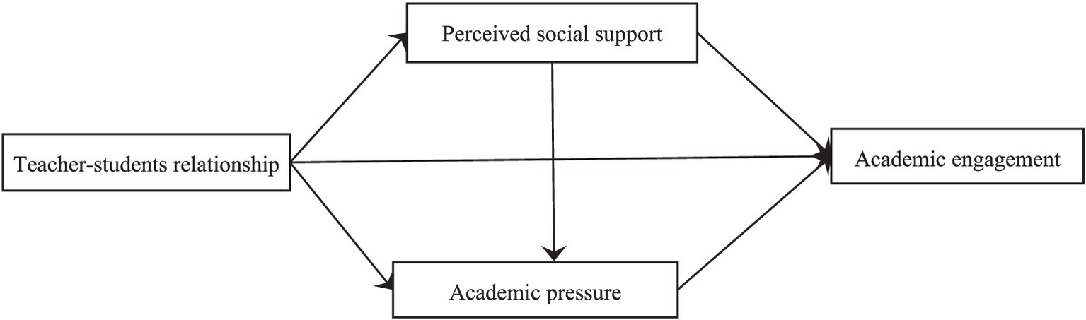 Although previous research has established that a strong teacher–student relationship can enhance students’ academic engagement, the mechanisms underlying this effect remain less explored. Therefore, this study examined the mediating roles of perceived social support and academic pressure in the association between teacher–student relationship and academic engagement. A survey involving 1,058 Chinese university students was conducted, with teacher–student relationship, perceived social support, academic pressure, and academic engagement being the evaluated factors. The results of structural equation modeling revealed that (a) teacher–student relationship directly and positively associated academic engagement, (b) teacher–student relationship indirectly and positively associated academic engagement through perceived social support, and (c) teacher–student relationship indirectly and positively associated academic engagement through both perceived social support and academic pressure. These results indicate that perceived social support and academic pressure are the primary factors mediating the effect of teacher–student relationship on academic engagement among university students.