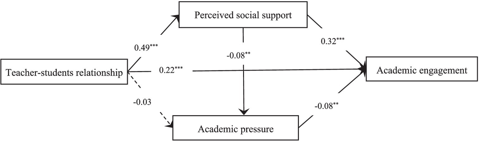 Teacher–student relationship could positively associate academic engagement through both perceived social support and academic pressure (H4).