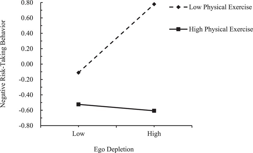 According to the limited resources theory, all self-control activities are dependent on limited resources and that ego depletion occurs when the performance of self-control is impaired (Heatherton and Baumeister, 1996). However, ego depletion is only temporary and energy resources can be recovered (Muraven and Baumeister, 2000). Physical exercise can recover energy resources. Exercise can train individuals’ strength (baseline ability) and endurance (ability to tolerate exertion) to improve self-control and reduce energy loss (Muraven et al., 1999). Previous research has demonstrated that mental energy resources are not only restored but enhanced through sustained exercise behaviors (Finley and Schmeichel, 2019). These energy resources help to broaden the mind and maintain focus, accompanied by more positive emotional experience, which counteracts negative emotions triggered by adverse environmental factors (e.g., ostracism), reduces psychological stress, and alleviate ego depletion (Huang et al., 2023). Additionally, evidence suggests that physical exercise can mitigate the negative effects of external risk environments (e.g., stress, family conflict, school bullying, etc.) on individuals’ mood and cognition (negative emotions, cognitive maladjustments), acting as a stress buffer (Sigfusdottir et al., 2011; Brown and Lawton, 2015; Kirklewski et al., 2020) and further reduces the likelihood of risk-taking behavior among college students (Newman et al., 2017). Therefore, we assume that physical exercise may moderate the relationship between and negative risk-taking behavior, as well as the impact of ego depletion as a mediator of this effect.