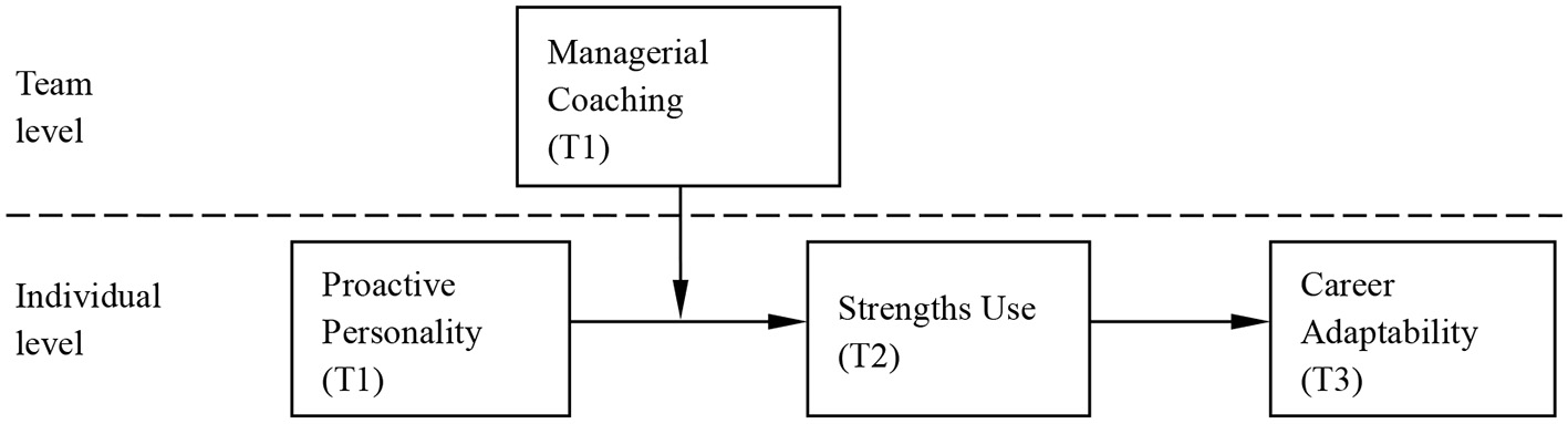 The current study aims to explore the mediating effect of strengths use and the moderating effect of managerial coaching on the relationships between proactive personality, strengths use, and career adaptability. First, drawing from the COR theory, we examine whether a proactive personality is linked to career adaptability and investigate the mediating effect of strengths use. Second, we integrate mediation and cross-level moderation effects to explore how managerial coaching moderates these relationships. This study holds two theoretical implications for the literature on strengths use and career adaptability. On the one hand, it investigates how individual personality traits differentiate career adaptability through specific work behaviors (i.e., strengths use), drawing from the intrinsic motivational state perspective (Kong and Ho, 2016). On the other hand, it delves into situational factors, such as managerial coaching, suggesting that employees are differently influenced in their ability to utilize their strengths to enhance career adaptability, and this finding is consistent with previous research that situational cues can influence the proactive personality–career adaptability relationship (Zacher, 2014).