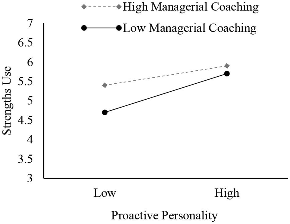 Unlike stable traits such as personal characteristics, strengths use is motivated by personality traits, the environment, and their interplay (Bakker and van Wingerden, 2021). Recent findings by Ding and Lin (2021) revealed that individual-focused transformational leadership and core self-evaluation interact to influence strengths use through positive affect. These effects might align with managerial coaching, providing guidance, suggestions, and inspiration to help subordinates realize their potential (Heslin et al., 2006). The COR theory also suggests that one resource can be substituted by another, generating equivalent value (Hobfoll, 2001), and supportive context can be a kind of compensation that contributes to the maintenance of resource reservoirs and resource gains. When managerial coaching exhibits more empowerment and facilitation behaviors (Ellinger et al., 2011), even less proactive employees may feel inspired and empowered, resulting in increased strengths use. However, highly proactive employees primarily respond to leadership through prescribed change, future-oriented initiatives, and self-initiative, rather than focusing on managerial coaching skills. Consequently, strengths use by highly proactive employees depends more on their personality and less on their leaders' actual behaviors.