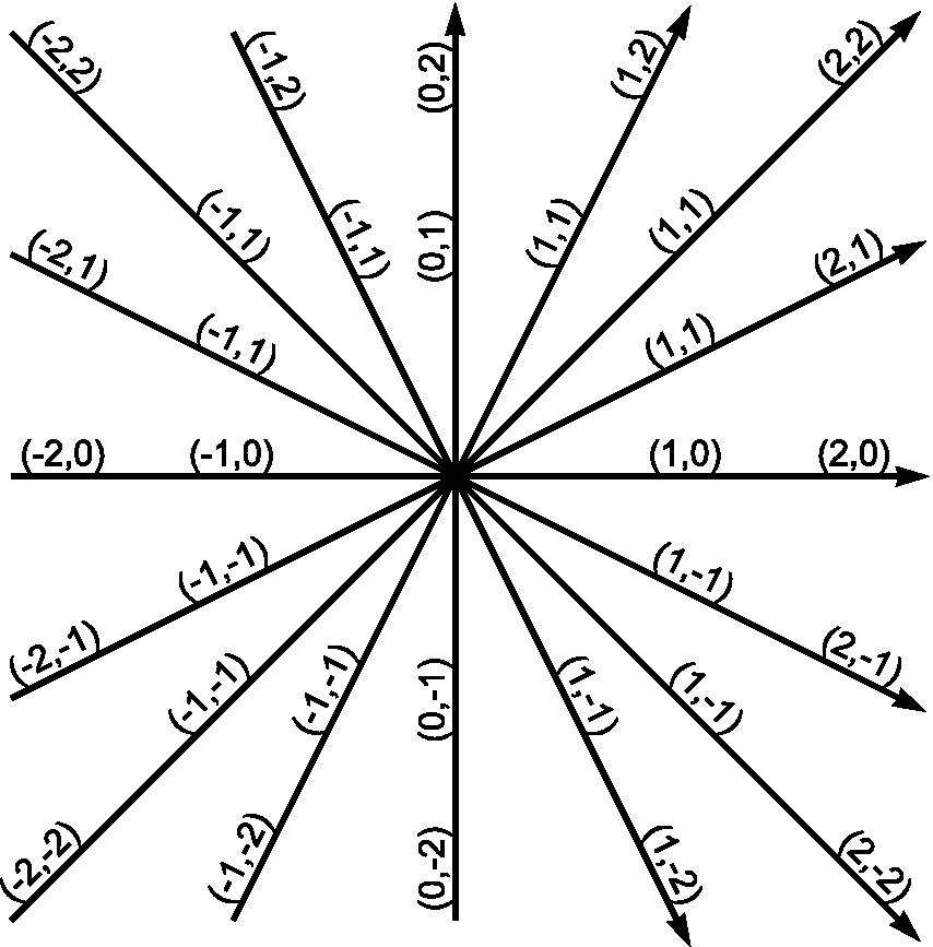 Cardinal vectors spanning the trust taxonomy. The Cartesian coordinates of points along each vector are shown. The Cartesian coordinates also form a 5×5 matrix with 25 cells.