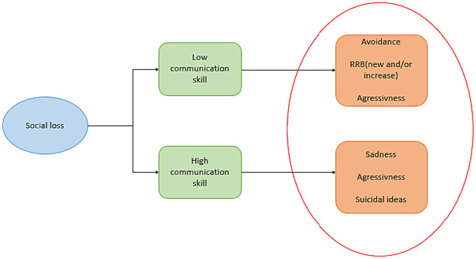 Figure 1. Impact of social loss on depressive symptoms of autistic adolescents according to their communication competence. There is a difference in depressive symptoms. Due to communication difficulties, autistic adolescents with communication difficulties express less sadness and suicidal ideas but show a behavioral response of avoidance or repetitive restrictive behavior (RRB) than autistic adolescents without communication difficulties. However (hetero- or auto-) aggressiveness manifests in both phenotypes.