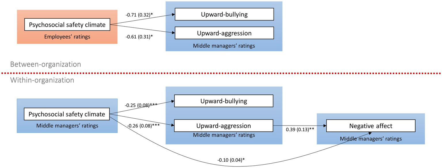 We assessed the between-group effects of PSC, as reported by employees and managers, on managers’ experience of upward aggression and bullying using negative binomial multilevel-modeling to account for skewness and excessive variance in the count data. A robust maximum likelihood (MLR) estimator was used with a group-mean centering for Level-1 independent variables. As shown in Figure 1, a multilevel homologous model was tested. Managers’ positive and negative affect were regressed on upward aggression and upward bullying at both between- and within-organizational level. At between-organizational level, upward aggression and bullying were regressed on organizational-level PSC, as reported by employees and managers. At the within-organizational level, upward aggression and bullying were regressed on managers’ self-reported PSC only. We also controlled for managers’ gender, age, and organizational tenure at the within-organizational level. Indirect effects of between- and within-level PSC, upward mistreatment and affects were estimated by bootstrapping. Due to the model’s convergence problems, we ran two separate multilevel models, one with employees’ reported PSC and the other with managers’ reported PSC at the organizational level: all variables and pathways were the same as those at the individual level.