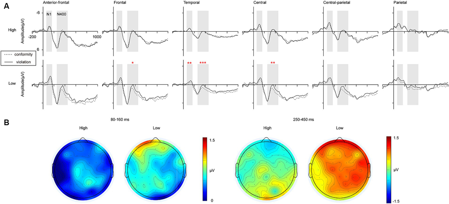 Waveforms and topographic maps. (A) Grand average event-related potentials (ERPs) of social norm violation task in the anterior-frontal, frontal, temporal, central, central-parietal, and parietal regions. The shaded 80–160 ms time window was used for the calculation of the average amplitudes of the N1. The shaded 250–450 ms time window was used for the calculation of the average amplitudes of the N400. (B) Topographic maps for the differences of N1 and N400 in the 80–160 and 250–450 ms time window (conformity – violation). HIGH, the high interpersonal intimacy; LOW, the low interpersonal intimacy.