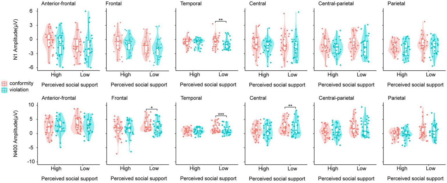 The ERP results indicate that, for individuals with a lower level of perceived social support, larger amplitudes of the N1 component (related to primary processing) and the N400 component (related to cognitive conflict) were observed when detecting others’ social norm violation compared to the conformity condition. However, for individuals with a higher level of perceived social support, no significant differences were found in detecting others’ conformity or violation of social norms.