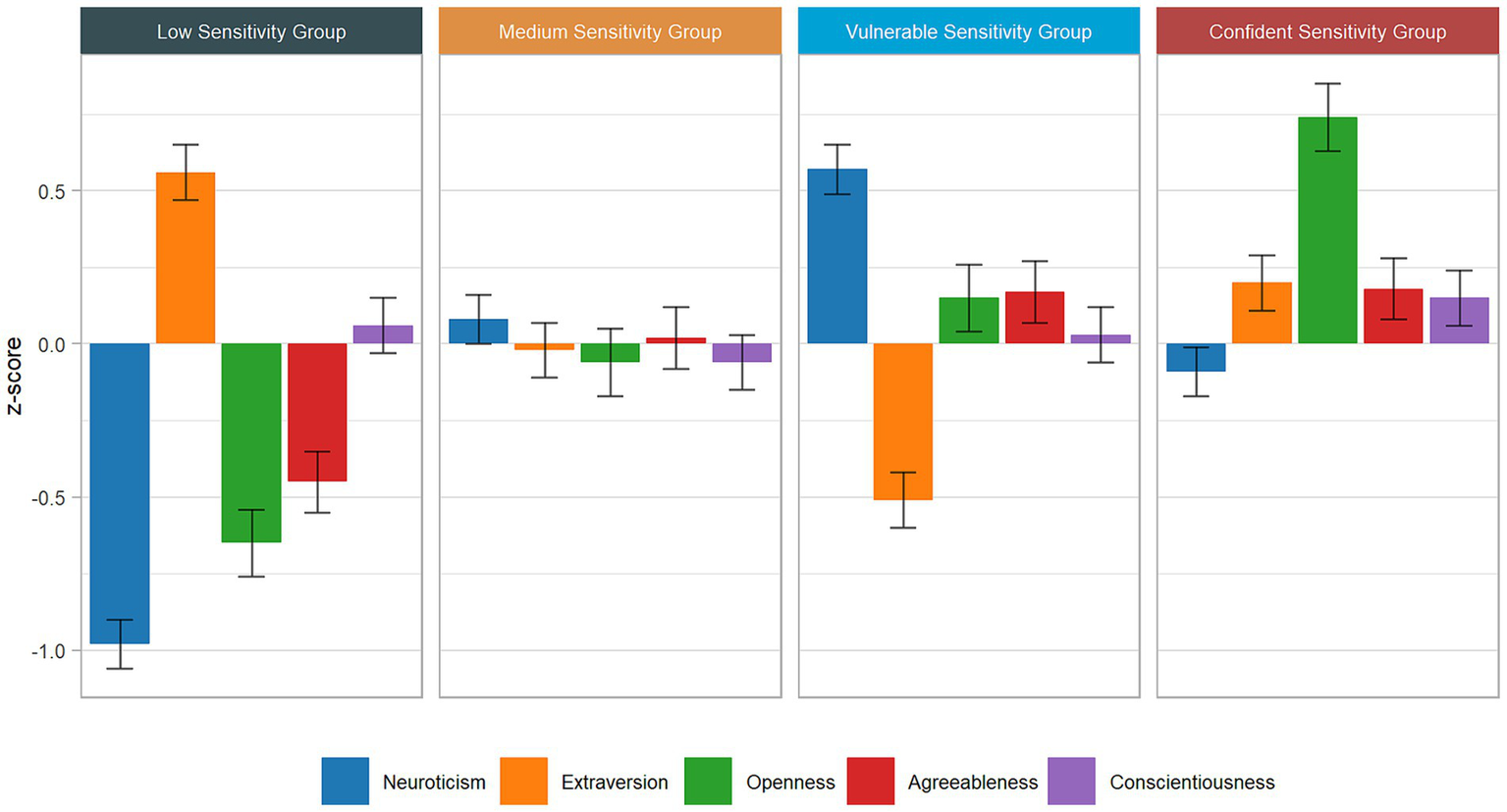 Beyond the frequently identified quantitative three-class differentiation of sensitivity groups, we obtained a four-class model that included two qualitatively different high-sensitivity groups, each displaying distinct HSPS subfactor and personality patterns that corresponded to prototypical personality profiles. Within these high sensitivity groups, (i) the Confident Sensitivity Group exhibited average Neuroticism, significantly above-average Openness, and slightly above-average Extraversion. By contrast, (ii) the Vulnerable Sensitivity Group displayed the typical personality pattern of significantly above-average Neuroticism, below-average Extraversion, and slightly above-average Openness. Personality analyses revealed that features such as passiveness, internalizing tendencies, giftedness, and aesthetics, often commonly ascribed to all highly sensitive individuals, are features that differ across distinct sensitivity groups.