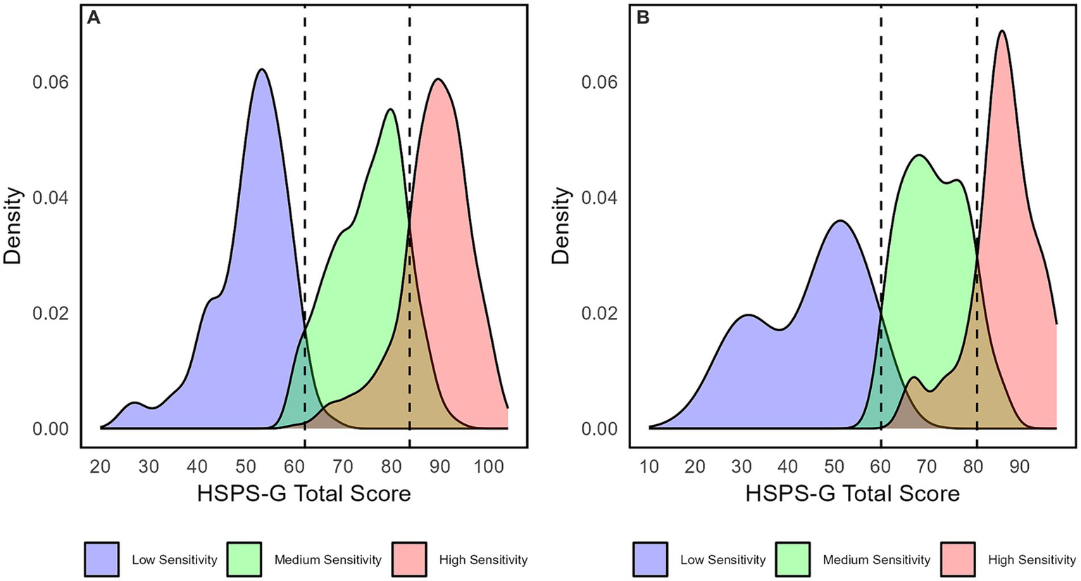 The few person-centered studies that have been conducted in the area of SPS have contributed to the understanding of the construct in three key ways. First, these studies have consistently demonstrated the quantitative differentiation of sensitivity groups, categorizing HSP into three categories: dandelions (low sensitivity group), tulips (intermediate sensitivity group), and orchids (high sensitivity group) in adults (Lionetti et al., 2018; May et al., 2020; Yano and Oishi, 2021), adolescents (Tillmann et al., 2021), and children (Pluess et al., 2018). Second, researchers have used external variables in combination with the HSPS to examine latent sensitivity groups. These analyses involve personality traits beyond SPS to explore how SPS interacts with other external personality constructs such as alexithymia (Jakobson and Rigby, 2021) and narcissism (Jauk et al., 2023). In order to provide valuable insights into potential behavioral dynamics (e.g., with regard to withdrawal tendencies in response to excessive demands), such studies have focused on the negative trait space of SPS. Third, Aron and Aron (1997) reported two qualitatively distinct clusters observed in three independent samples. One highly sensitive group exhibited a well-adjusted trait profile indicating resilience, whereas the other group displayed greater maladjustment indicating vulnerability, characterized by high emotionality and introversion. The authors suggested that the latter personality pattern might arise due to an early-forming insecure attachment style stemming from a troubled childhood, combined with a genetic predisposition to sensitivity. In contrast to the vulnerable sensitivity group, the well-adjusted group demonstrated the opposite pattern, displaying more emotional stability and reporting happier childhood experiences. In essence, these different sensitivity groups reflected patterns in the personality domains of Neuroticism and Extraversion (Eysenck, 1991).