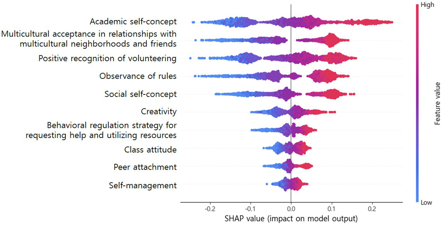After fitting the random forests, the absolute average of the SHAP values was calculated to assess the relative importance of the features in predicting the sense of community. Figure 1 shows the top-10 features with the highest feature importance in descending order, and the horizontal length of each bar indicates the magnitude of the average contribution to the model (Taye et al., 2023). As shown in Figure 1, “academic self-concept” was derived as the variable most relevant to high school students’ sense of community. Next, “multicultural acceptance in relationships with multicultural neighborhoods and friends,” “positive recognition of volunteering,” “observance of rules,” “social self-concept,” “creativity,” “behavioral regulation strategy for requesting help and utilizing resources,” “class attitude,” “peer attachment” and “self-management” were ranked as the top 10 variables according to feature importance (average absolute Shapley value), suggesting that these features contribute the most significantly to predicting individual sense of community.