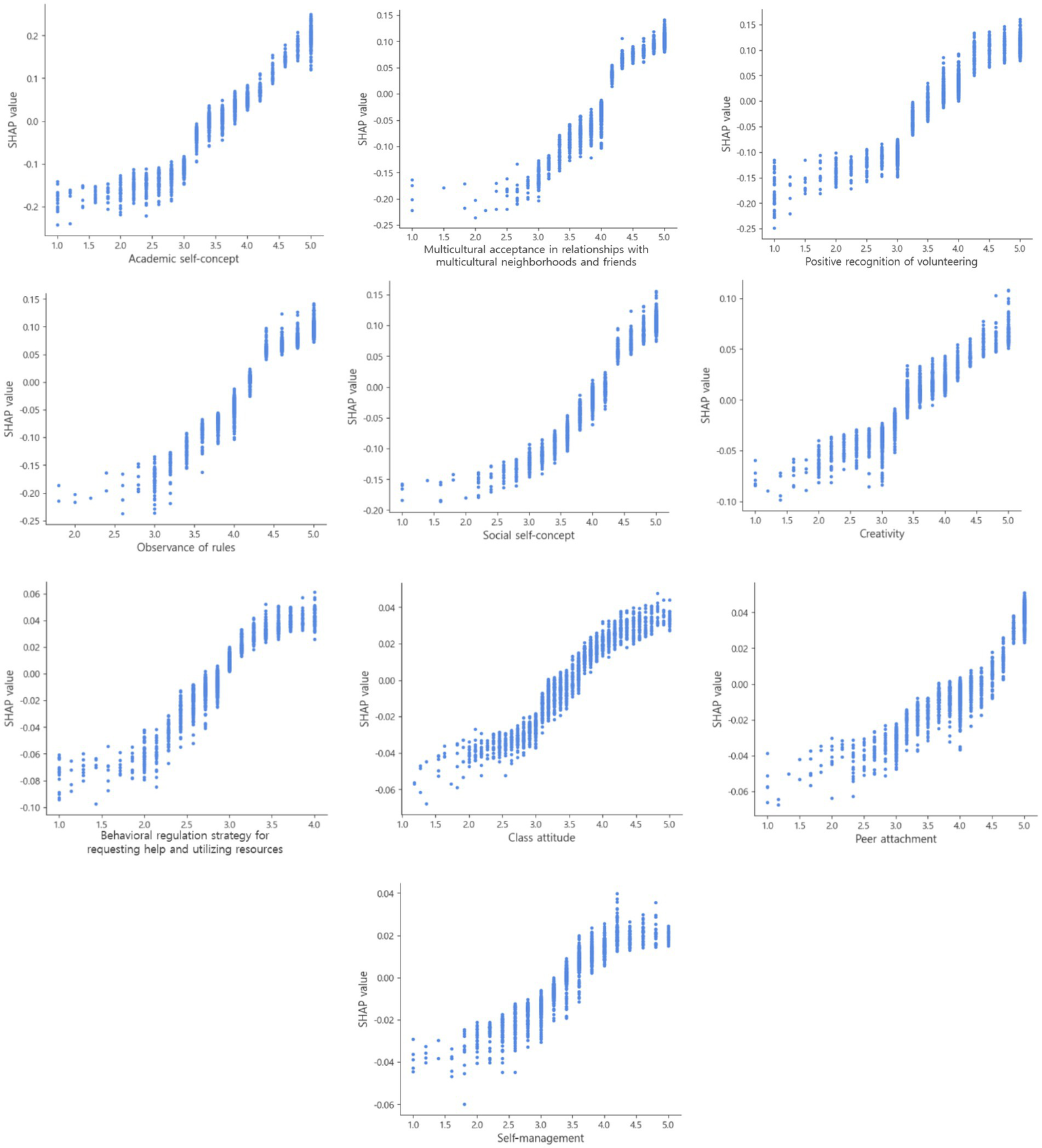 In Figure 3, the exact relationships between the top 10 predictors and sense of community are visualized through the SHAP dependence plot. The SHAP dependence plot is a scatter plot of predictors and Shapley values, where the x-axis indicates the raw values of each predictor and the Shapley value of the same predictor is on the y-axis (Lundberg et al., 2020; Zhang et al., 2022). Figure 3 shows that as the raw value of “academic self-concept” increases from 1 to 5, the SHAP value also shifts from negative to positive. This can be interpreted as indicating a positive relationship between the two variables, with higher academic self-concept tending to be associated with a greater sense of community. The other nine predictors also showed that as the raw value increased, the SHAP value tended to increase, suggesting positive relationships between the predictors and sense of community.