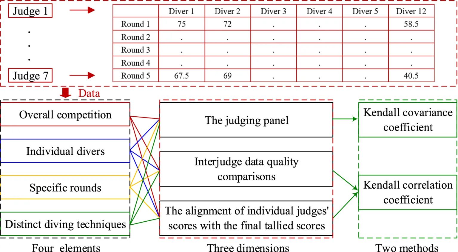 In the context of diving competitions, each judge incurs a penalty of 0.5 points (Guo, 2021), rendering the judge’s scores as ordered data. This study employs the Kendall covariance coefficient to assess the overall data quality of judge group scoring. Additionally, the Kendall correlation coefficient is utilized to evaluate the quality of data between pairs of judges, as well as the alignment between each judge’s scores and the final overall score.