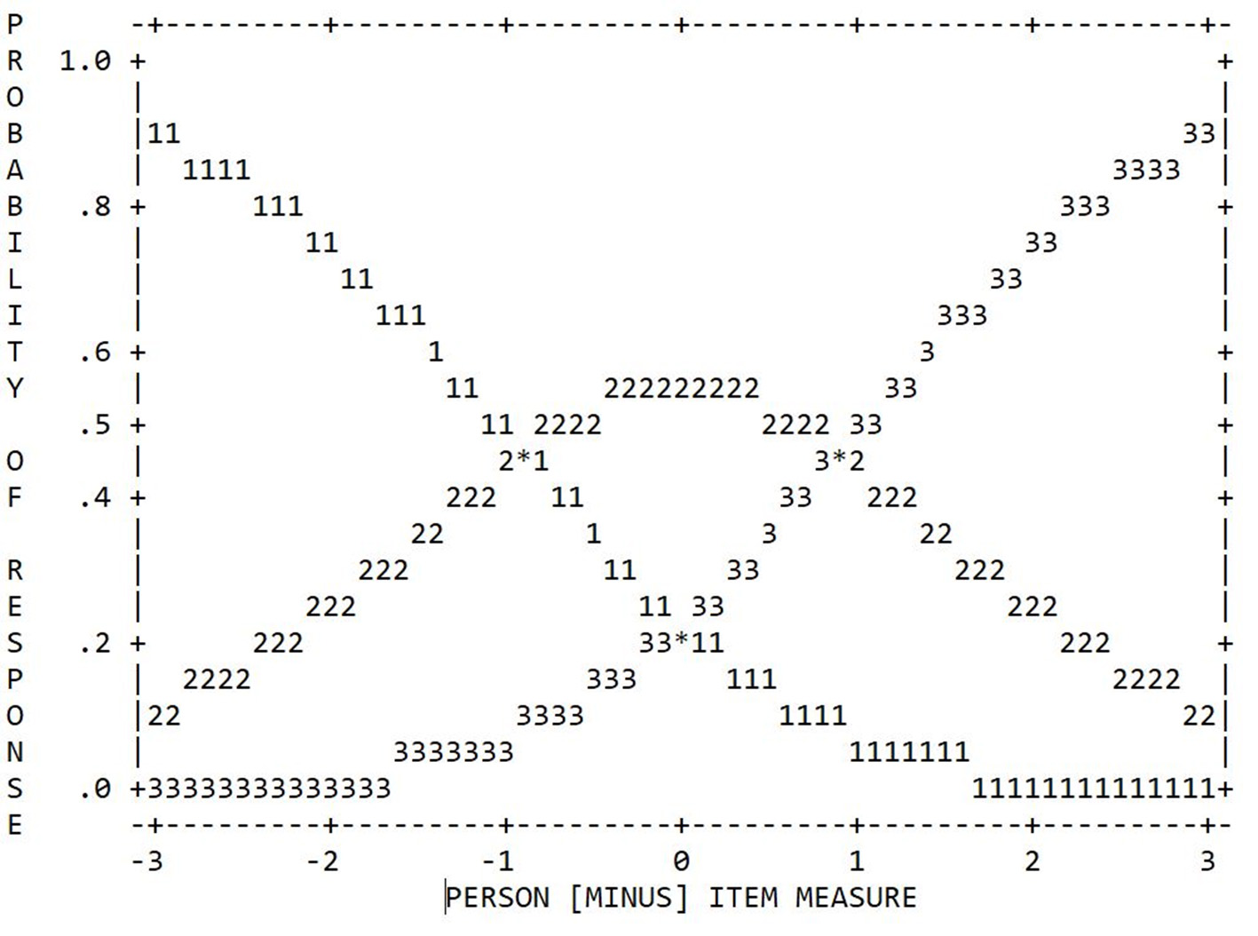 Therefore, overall, our findings for the initial 5-category structure were rather heterogeneous, revealing at least some potential for optimization, above all with respect to Category 1, but also with respect to Categories 2 and 5. Although both the average measures and the step difficulties increased monotonically (the latter even with a satisfactory advance of >1.00 logit), the point-biserial correlations in particular indicated that the exterior categories provided comparatively little or little precise information about the trait of interest. The latter assumption was also supported by the coherence indices. We therefore tried to improve the scale's measurement quality by collapsing Categories 1 and 2 and also Categories 4 and 5 into one category each, resulting in an overall 3-category scale (see Figure 3).