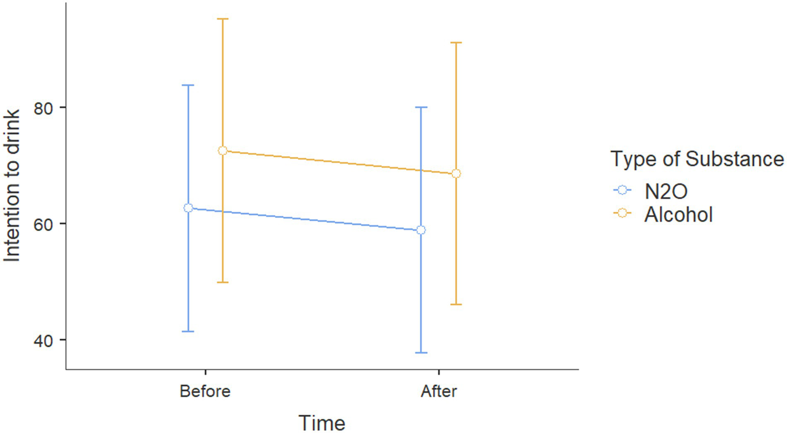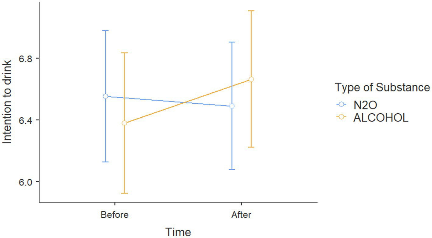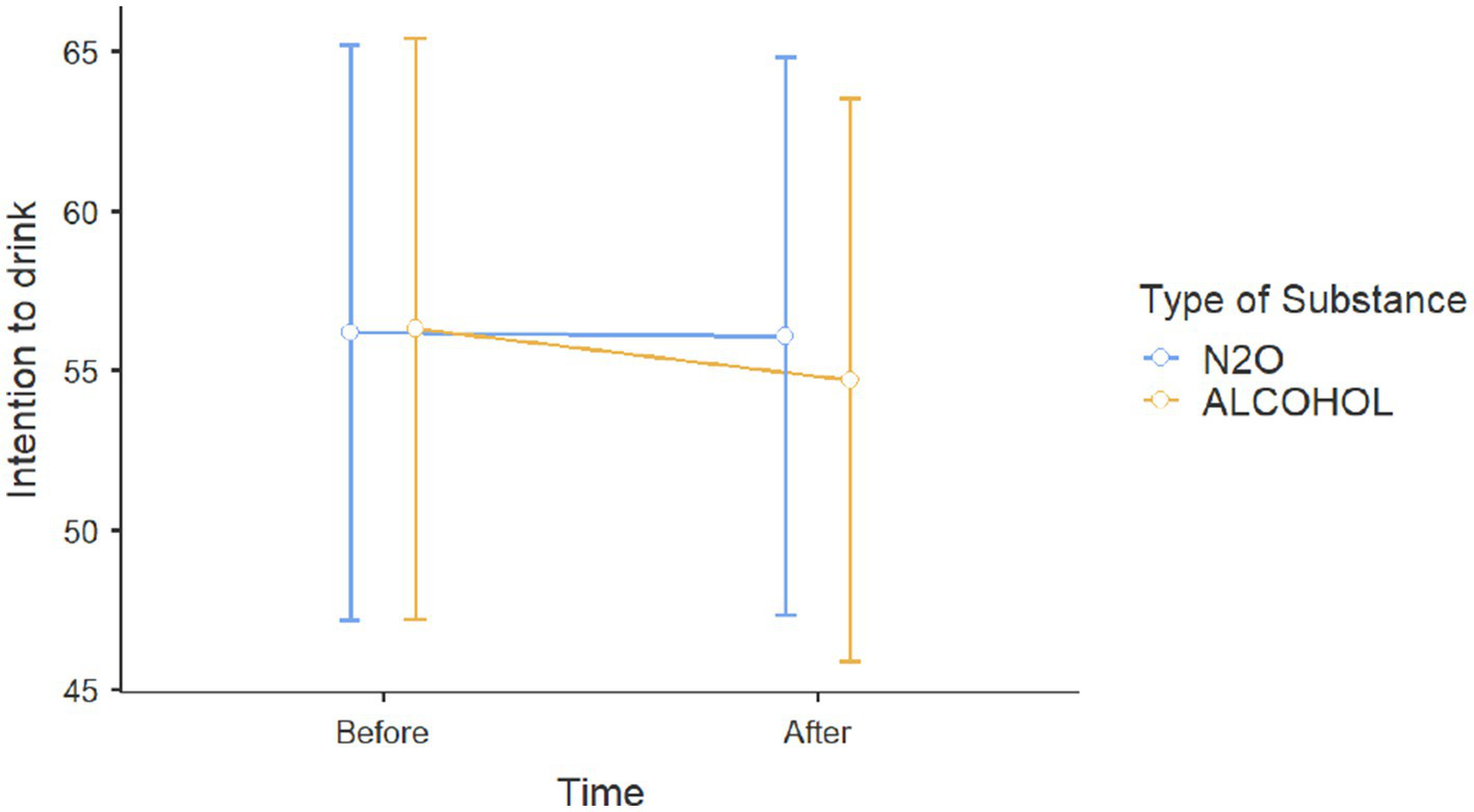 | Intention to consume alcohol before exposure | N2O exposure | 69 | 55.304 | 35.843 |