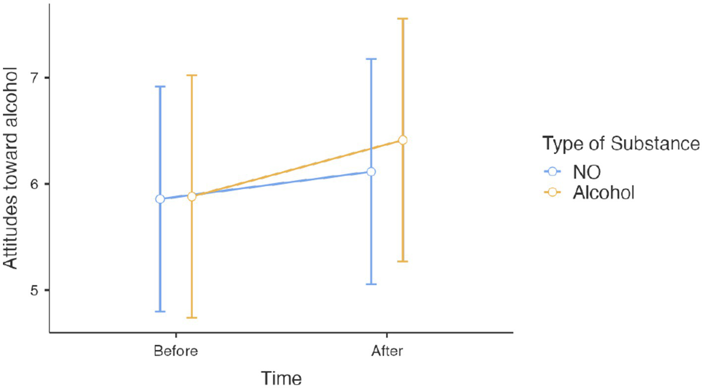 In Action 4 (Supporting party organizers through a dedicated web page), we conducted an online experiment to assess the impact of a website1 offering information about (i) alcohol, and (ii) emerging addictive substances (MDMA, N2O, CBD). Action 4 included young adults aged 18 to 25 from the universities of Nantes and Nanterre who visited the montetasoiree.com website. Participants had to give informed consent and complete the pre- and post-exposure questionnaires. Exclusion criteria were those outside the specified age range, those who did not give their consent. The goal was to determine whether exposure to these webpages would affect attitudes toward, and intentions to consume, alcohol and emerging substances. Like in Action 3, the website was taken from a pre-existing site that had been used for an alcohol and emerging substances prevention campaign. As in Action 3, it was complicated to evaluate the target population directly without compromising the effectiveness of the intervention, so we proposed an evaluation of a group of students who corresponded to the target (age and diversity of profiles). A total of 66 students were exposed to the page containing information on alcohol, while 64 students viewed the page on emerging substances (mean age 19.68 years, SD = 3.6; 94% female) from the Universities of Nantes and Nanterre. The sex ratio indicated a much larger proportion of female participants, which could potentially affect the results given that there may be sex differences in attitudes and behaviors related to alcohol and drug use. The participants were asked to respond to an online questionnaire before and after viewing a webpage. The webpage they viewed was randomly selected between (i) a page from the website providing information on alcohol drinking (i.e., effects on health and how to drink responsibly), or (ii) a page discussing emerging substances (i.e., effects on health and how to mitigate their effect when consuming). We measured (i) attitudes toward alcohol and emerging substances, (ii) intentions to consume alcohol and emerging substances, and (iii) age and sex.
