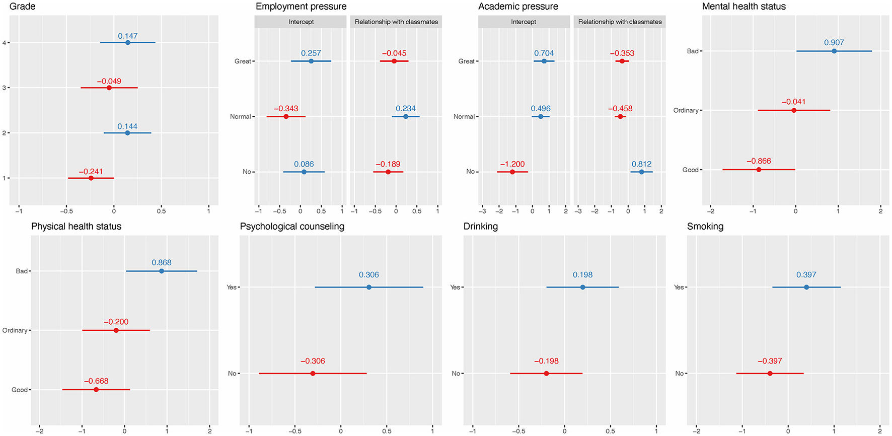 Special attention should be paid to the four statistical methods we utilized in association analysis. Except for the usual models of multiple linear regression and binary logistic regression, two mixed effect models were adopted such as linear mixed model and logistic random effect model. All these models are variations of the generalized linear mixed model (Bolker et al., 2009; Stroup, 2013). The mixed model is also known as the hierarchical model and contains both fixed and random effects. The random effects model represents the variability between different conditions or blocks, and they are incorporated into the model to account for the correlation between observations. In the present study, the four regression models were conducted with standard diagnostics, ensuring more accurate parameters and p-values. Various studies have utilized regression models to identify risk factors associated with poor sleep quality, but few strictly performed regression diagnostics, which can potentially result in biased results.