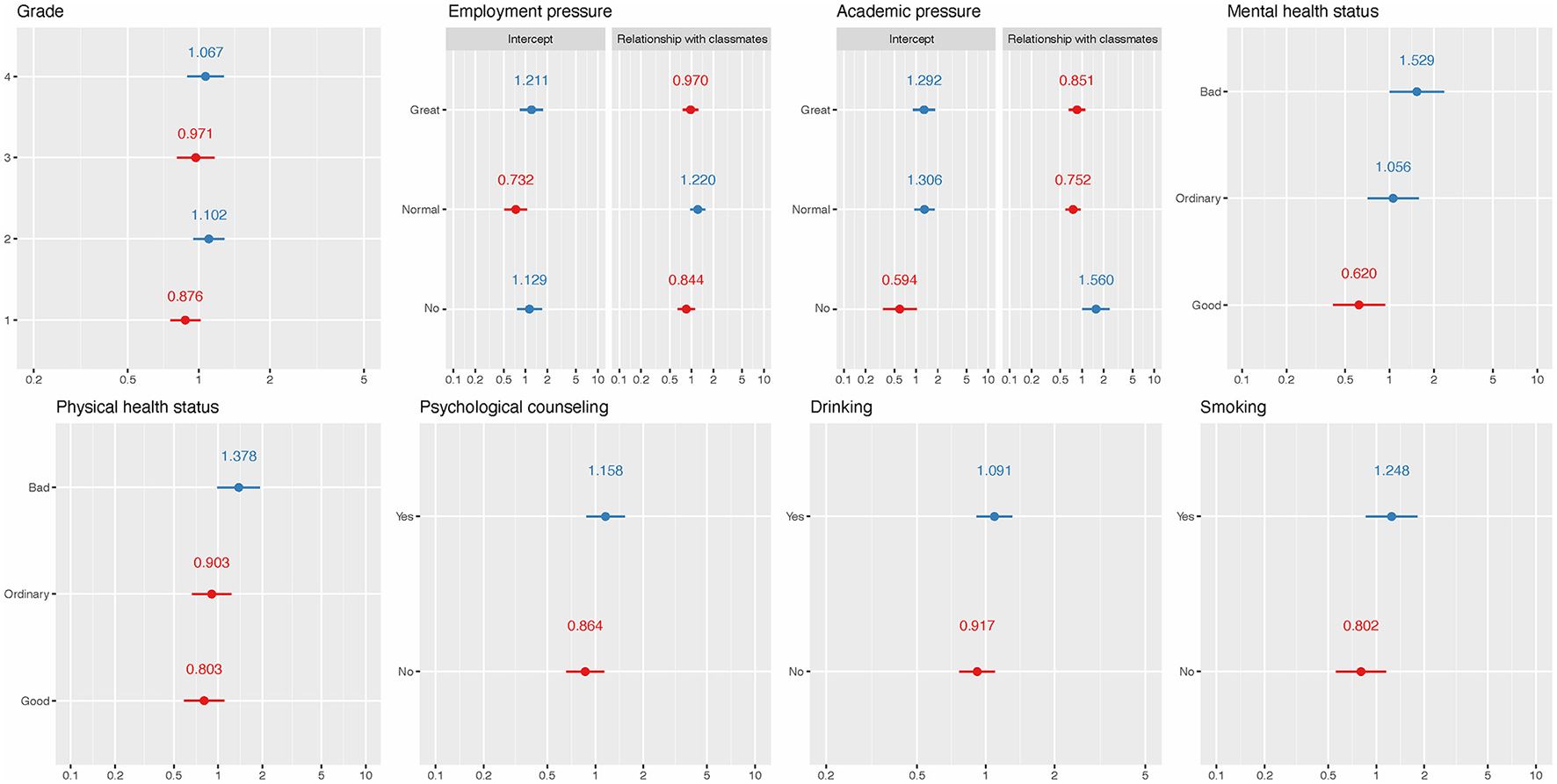 Some studies have shown that sleep quality among Chinese undergraduates was a result of various factors. A cross-sectional study reported a few risk factors such as poor academic performance, interpersonal relationship, skipping breakfast, and higher grades (Wang et al., 2016). Another study found that being a freshman, alcohol use, gambling, exercising for more than 30 min a week on <1 day, satisfaction with parental love, and harmonious relationship with classmates were risk factors, while no learning pressure, never having self-injurious behaviors, and harmonious family relationship were protective factors (Li Y. et al., 2020). A gender-specific study in China identified some risk factors for poor sleep quality that were related to weak physical condition and smoking in males, while noisy dormitory, skipping breakfast, drinking coffee, playing games, bad physical condition, and severe academic stress led to poor sleep quality in females (Zhou et al., 2022). A cluster randomized-controlled trial in China showed that good dormitory sleep environments could maintain good sleep quality (Li et al., 2022). In addition, the use of electronic products was also related to poor sleep quality (Demirci et al., 2015; Li L. et al., 2020). For example, using mobile phones, computers, and other electronic products at night could affect the regulation of the sleep clock, prolong the time to fall asleep, and shorten sleep time. Besides, there is a significant amount of similar research evaluating related factors for sleep quality (Nyer et al., 2013; Bi et al., 2022; Peltz and Rogge, 2022; Xian et al., 2022). In summary, these factors that are associated with undergraduates' sleep quality can be classified into the following categories: demographics, personal lifestyle, family support, social support, dormitory environment, physical health, and mental health.