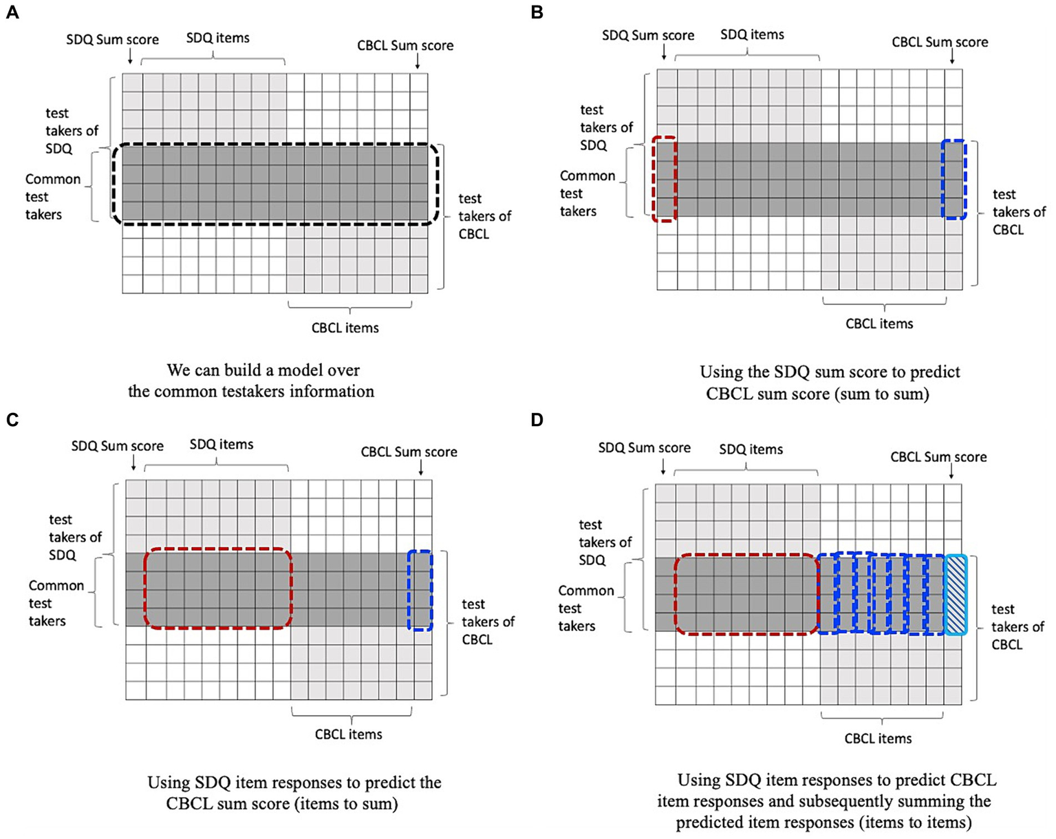 Illustration of using common persons design for harmonization. (A) shows the common person harmonization problem. We have two tests SDQ and CBCL; for the common person, we have the responses for both sets of items. Thus, we can train and validate a model for predicting the outcomes of one test from the other one over the information of common persons using three different ways. (B) shows the sum to sum method for harmonization using machine learning. (C) demonstrates the items to sum approach, and (D) depicts item to items approach.