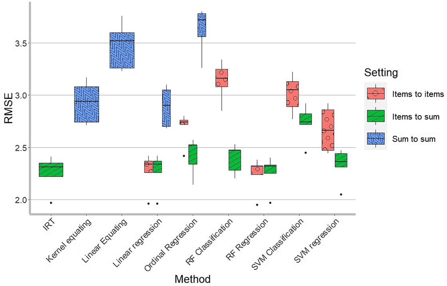 Boxplot of RMSEs in 5-fold cross-validation, as a function of harmonization method. Per method we see the spread of the RMSEs in the 5-fold cross-validation. There are in total 17 boxplots. 6 for items to items setting (Linear regression, Ordinal regression, RF classification, RF regression, SVM classification and SVM regression), 7 for items to sum setting (IRT, Linear regression, Ordinal regression, RF classification, RF regression, SVM classification and SVM regression) and 4 for sum to sum setting (Linear equating, Kernel equating, Linear regression and Ordinal regression).