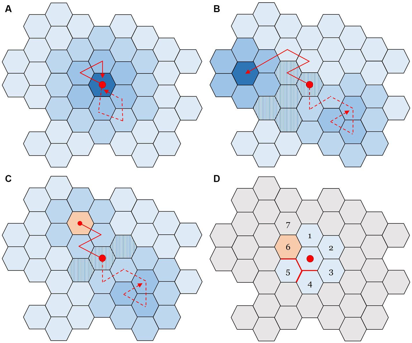 Figure 2. Representations of a space of possibilities, where each tile is a system state. Solid and dashed lines indicate alternative paths that can be explored, stemming from an initial condition marked by the red dot in the center of the space. (A) The simple case with only one attractor. After the system is perturbed, it tends to return to the original state. (B) A situation with two attractors, whose depth is indicated by darkness of color. They “trap” and hold the system if it enters the basin of attraction (darker blue), making the system less likely – in proportion to attractor depth – to leave after being captured. A tipping point from one attractor to the next occurs when the system residing in one of the attractors crosses the striped tiles. (C) Space with one attractor leading to a systemic ruin risk (orange tile); trajectories that land there are permanently halted. The dashed trajectory depicts a route to the “safe” attractor, but the ruin state nonetheless remains as a possibility. (D) A space of possibilities, as seen from the policy maker’s perspective: only the “adjacent possible” states can be observed. Gray tiles represent states that are unknown (see text for details). Figure exapted from Lewin (1951, p. 92).