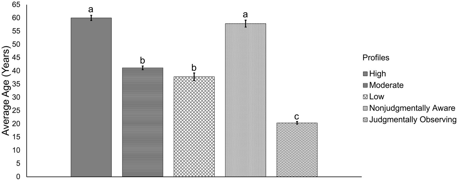 Figure 2. Age across the five mindfulness profiles. Different subscripts depict significantly different means at p < 0.005. Conversely, bars that share subscripts depict no significant difference across their means. For example, subscript a occurs across the high and nonjudgmentally aware bars for age and thus, these profiles do not significantly differ in average age. However, the high and nonjudgmentally aware profile do significantly differ from the other three profiles that do not share the a subscript.