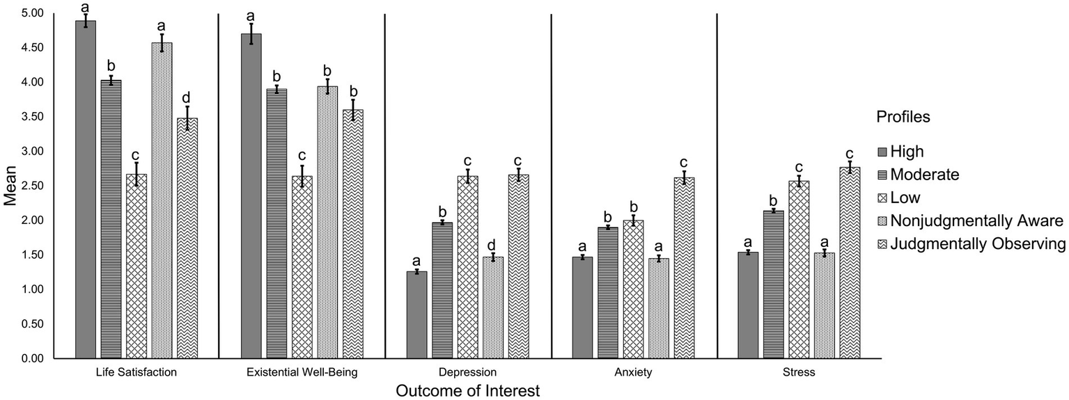Figure 3. Mental health and well-being across the five mindfulness profiles. Different subscripts within a certain outcome of interest depict significantly different means at p < 0.005. Conversely, bars that share subscripts depict no significant difference across their means. For example, subscript a occurs across the high mindfulness and nonjudgmentally aware bars for life satisfaction and thus, these profiles do not significantly differ in life satisfaction scores. However, the high and nonjudgmentally aware profiles do significantly differ from the other three profiles that do not share the a subscript.