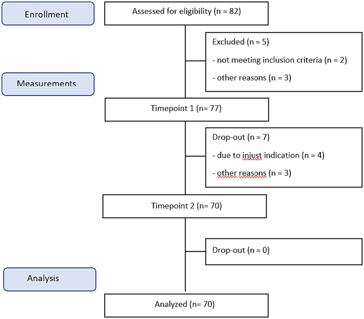 Since the current study is an explorative study, we did not use a power analysis, instead we included as many participants as possible in a predetermined timeframe. A total of 77 patients were included in the period between January 2022 and June 2023 (see Figure 1). Patients were eligible for inclusion in the study if they met the following criteria: (1) aged between 18 and 65 years, (2) currently diagnosed with a personality disorder, mood disorder, or anxiety disorder according to the Diagnostic and Statistical Manual for Mental Disorders, fifth edition (DSM-5, American Psychiatric Association, 2013), and (3) had undergone at least one evidence-based treatment (CBT) for the aforementioned diagnosis in primary or secondary care. Patients were excluded from the study if they met any of the following criteria: (1) insufficient proficiency in the Dutch language, (2) a recent suicide attempt within the past three months or current active suicidal ideation, (3) diagnosed with a psychotic and/or bipolar disorder, (4) hospitalized due to self-mutilation within the past three months, (5) diagnosed with a complex dissociative disorder and/or experiencing dissociative symptoms, or (6) diagnosed with a substance use disorder, excluding tobacco, according to the DSM-5 criteria.