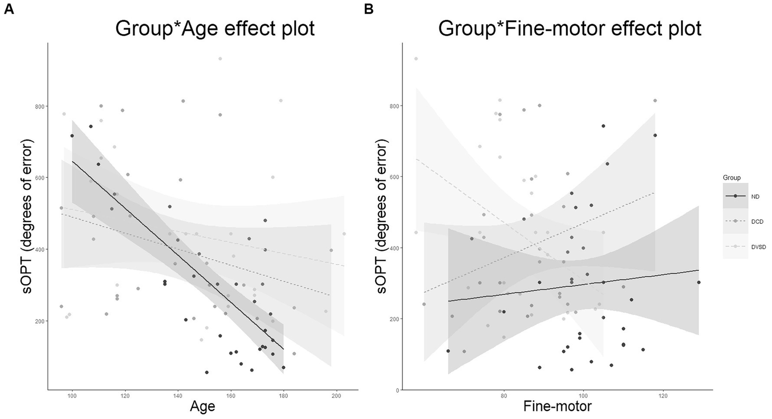 A significant main effect of group was found for the sOPT task [F(2,82) = 3.97, p = 0.023; η2p = 0.088], with both the DVSD and DCD groups performing worse (i.e., higher degrees of error) than the ND group (respectively, p = 0.009 and p = 0.05). No significant difference emerged between the DVSD and the DCD groups (p = 0.515).