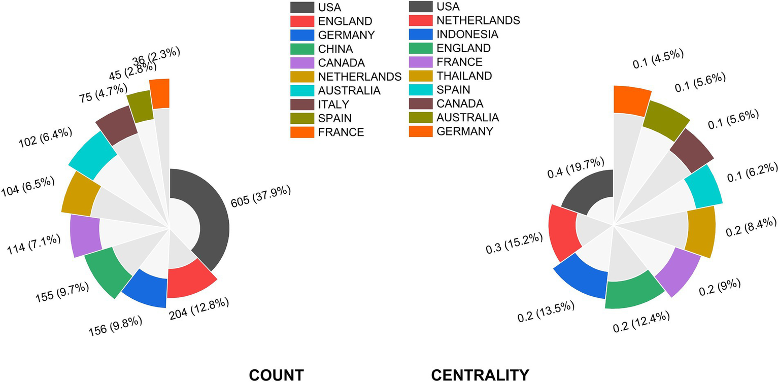 The top 10 countries in terms of articles and the value of trustworthiness research are presented in Figure 3. The United States has the most documents and the highest degree of centrality within the search area, indicating that it has the closest academic research relationship with other countries and contributed considerably to research innovation, which had a major effect. Despite the importance of trust, scholars have not given it much consideration for a long time. This hush did not break until the 1950s, when American psychologist M. Deutsch conducted the first experimental investigation of trust in the Prisoner’s Dilemma (Deutsch, 1958). Subsequently, many scholars in psychology, economics, sociology, political science, and other disciplines began to conduct in-depth research on trust issues from their own perspectives, resulting in an increase in trust research abroad and the formation of some relatively systematic trust research theories. This may be the reason why the United States is the highest degree of centrality country. The United Kingdom, Germany, China, Canada, the Netherlands, Australia, Italy, Spain, France, and other countries have high levels of production. The top three countries with the highest centrality are the United States, the Netherlands, and Indonesia. Germany and China publish the same number of papers, but their respective centralities are only 0.08 and 0.05, respectively, indicating that both have weak trustworthiness and should boost it.