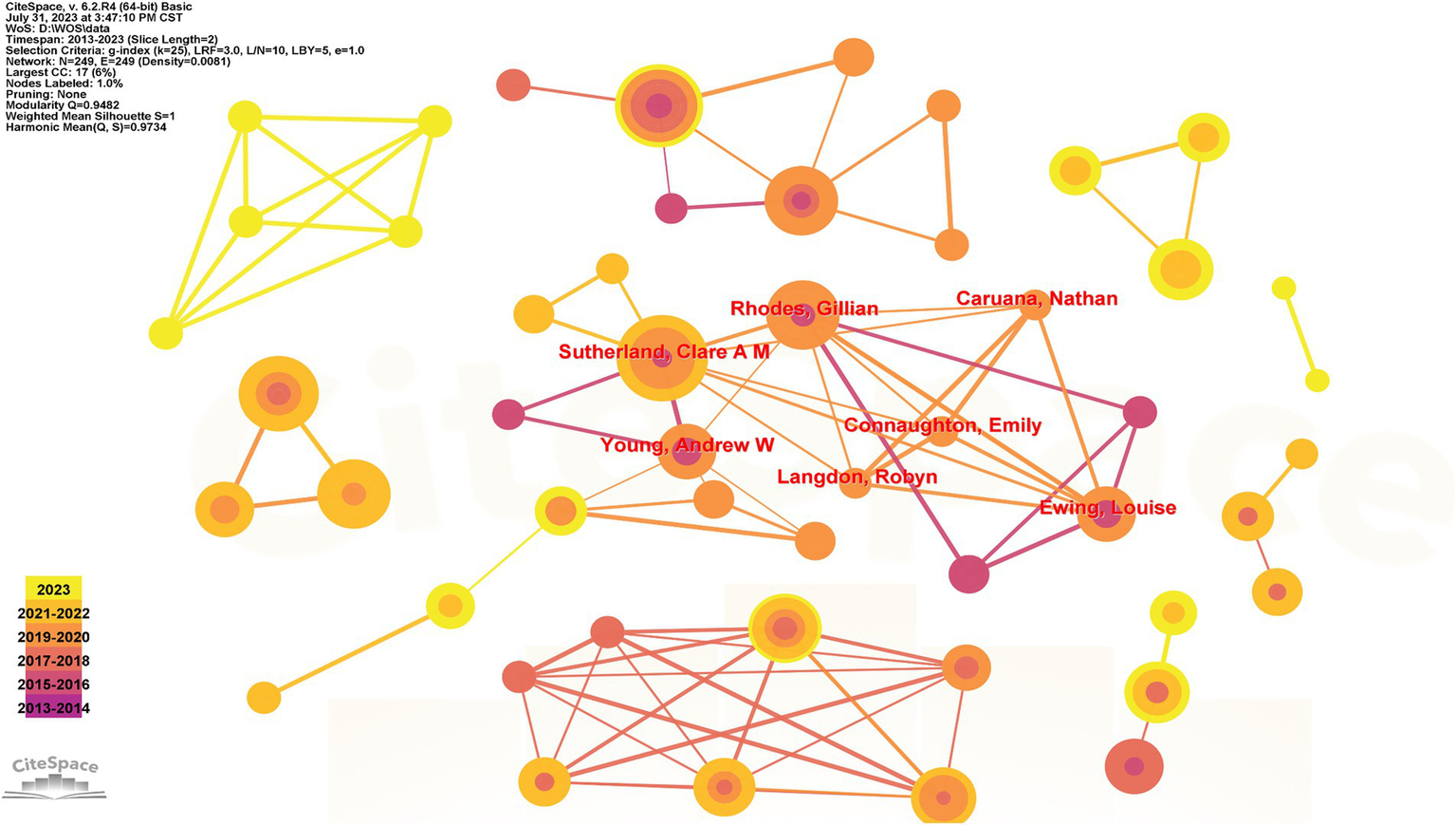 A network density of 0.0081, 249 nodes, and 249 connections are present. Only the authors with the highest links are shown in Figure 5. According to the figure, a crucial collaborative group has developed in the field of trustworthiness research with high-production authors like Sutherland, who primarily studies the detection of facial clues to trustworthiness. His most popular article is that social inferences from faces: ambient images generate a three-dimensional model, which developed and validated a 3D model (approachability, dominance and youthful-attractiveness) through 3 experiments, and studying two-dimensional valence or trustworthiness through a dominance model of face social inference. What’s more, his findings highlight both the utility of the original trustworthiness and dominance dimensions and the need to utilize various facial stimuli, as well as further highlight the importance of youth and attractiveness perception in facial assessment (Sutherland et al., 2013).