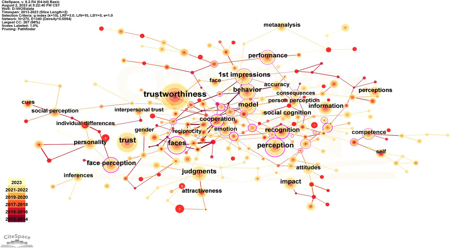 Keywords act as both an overview of the topic and the thesis’s main point of view. The amount of attention within an area of study can be seen by high keyword frequency and centralization. It may reflect advanced research methods, hot issues that need to be addressed, or academic topics that interest researchers over a given period. Within the scope of retrieval, there are 270 nodes and 340 links in the knowledge map of the keyword network, with a density of 0.0094 (see Figure 6). The top 10 keywords for frequency and centralization are listed in Table 5. The three keywords with the highest frequency are perception, trust, and trustworthiness, with frequencies of 387, 206, and 161, respectively. Competence, model, and facial expressions were the top three in terms of centrality, at 0.11, 0.10, and 0.09, respectively. Combining high-frequency keywords with associated literatures reveals that trustworthiness research focuses primarily on anex-dependent and post-dependent variables such as ability, facial expression, first impression, and So On. These keywords are closely related to other keywords around, which is more important and has greater influence in the research.