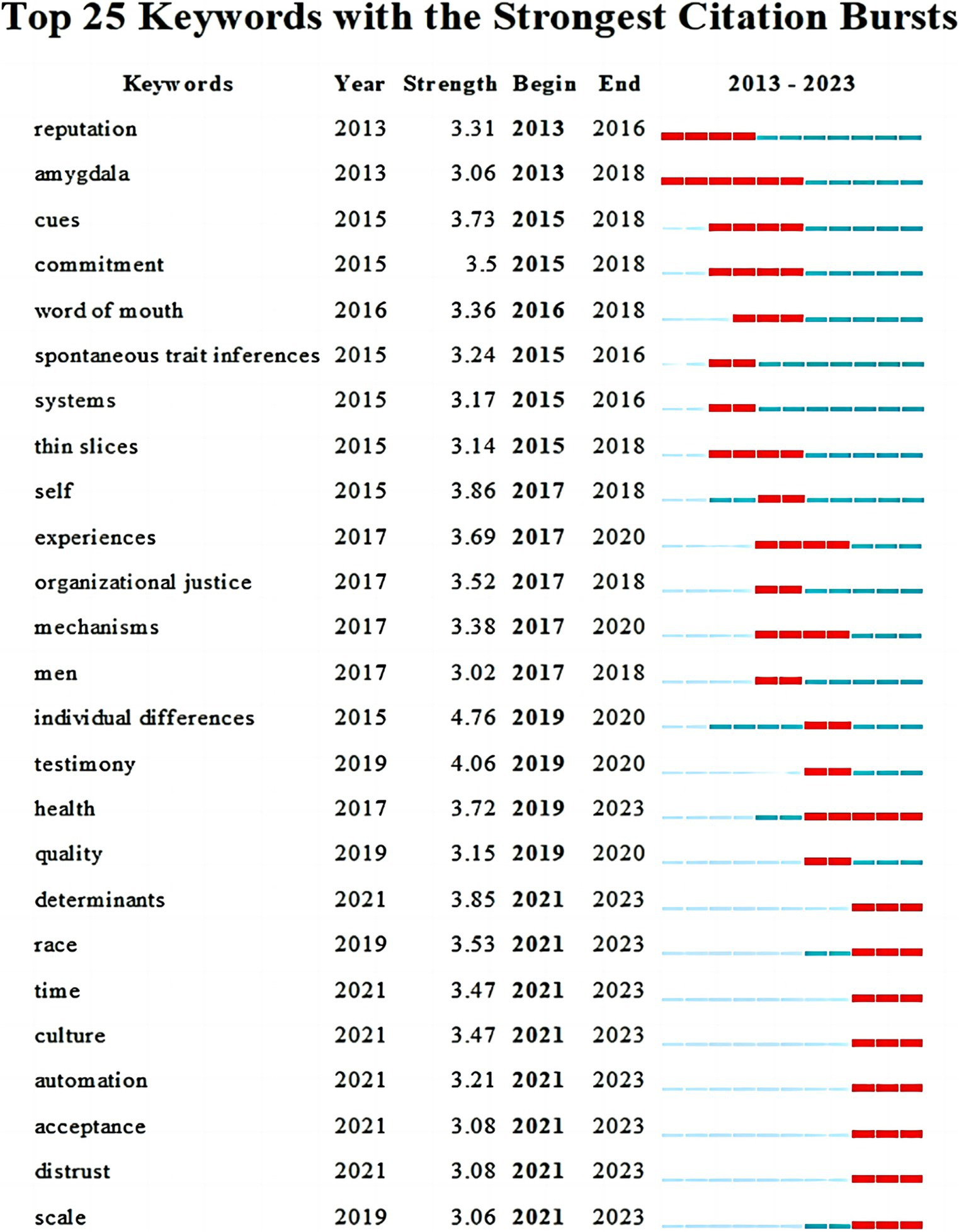 One of the authors who is frequently cited, Todorov A, also emphasized the trustworthiness of faces, linking them to emotions and neurons and studying how people perceive, evaluate, and absorb the social world. The author with the highest burst value, Brambilla M, also studied face trustworthiness. However, Brambilla showed that the facial aspect ratio and the tone of the voice can influence social perception. The research focused on the effect of auditory and visual cues on facial trustworthiness. The author Jaeger B, with the highest cited bursts, studied the effects of facial trustworthiness cues on social decision-making and social interactions. This indicates that research on trustworthiness focuses mainly on facial trustworthiness.