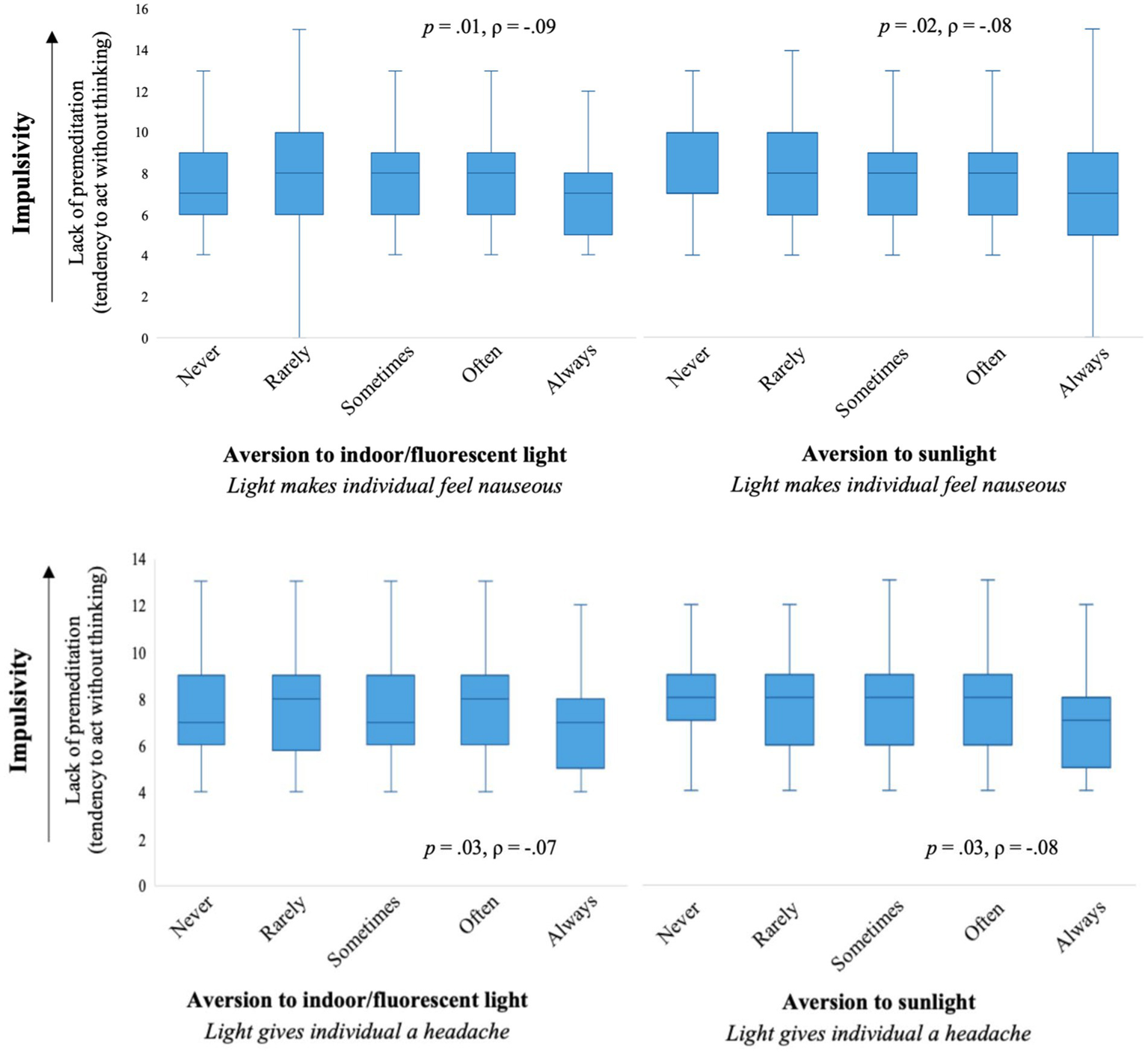 Perseverance (lack of) did not significantly correlate with any aspects of light aversion (all p > 0.05). Premeditation (lack of) did not significantly correlate with finding light aversive; however, individuals who found bright indoor light and/or sunlight made them nauseous or gave them a headache had greater premeditation, meaning they were more likely to act with consideration of the potential consequences of their behavior (all p < 0.001; see Figure 3). These findings were lower than the unadjusted Spearman’s rank correlation, except for the association between sunlight making an individual nauseous and premeditation which was consistent with the unadjusted Spearman’s rank correlation. Lastly, the facet of sensation-seeking did not significantly correlate with most aspects of light aversion (p > 0.05), except for individuals who found sunlight gave them a headache as they had lower sensation seeking (p = 0.001). See Table 1 for the Spearman’s correlations.