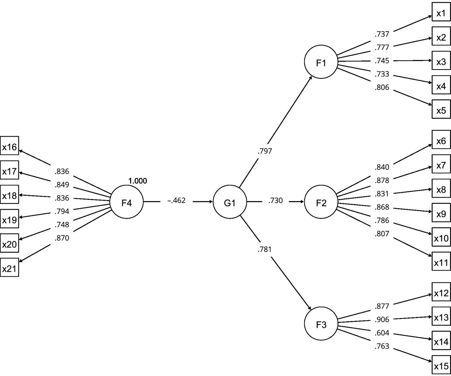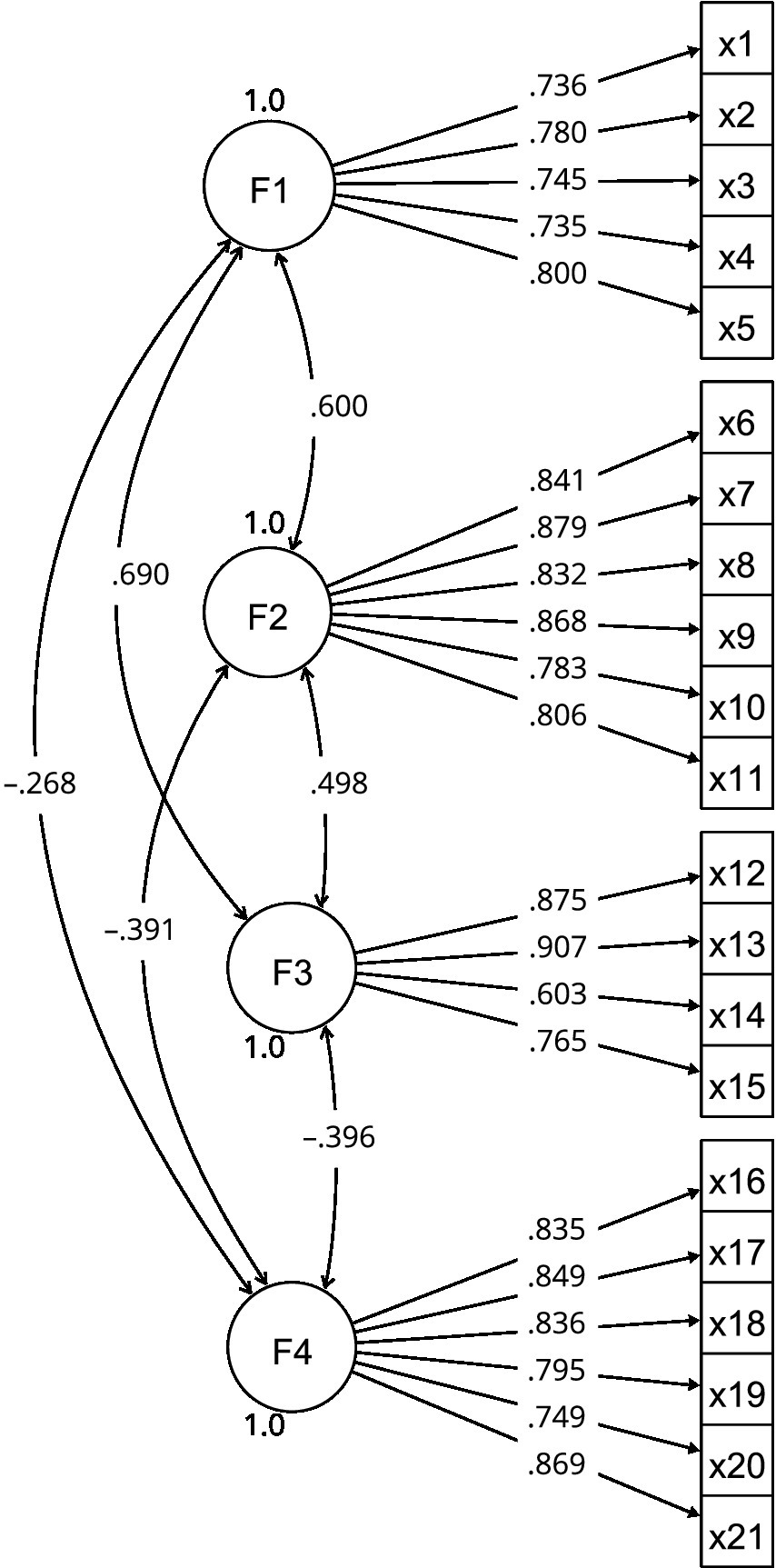 | Factors | Saturations | F1 | F2 | F3 | F4 | ||||