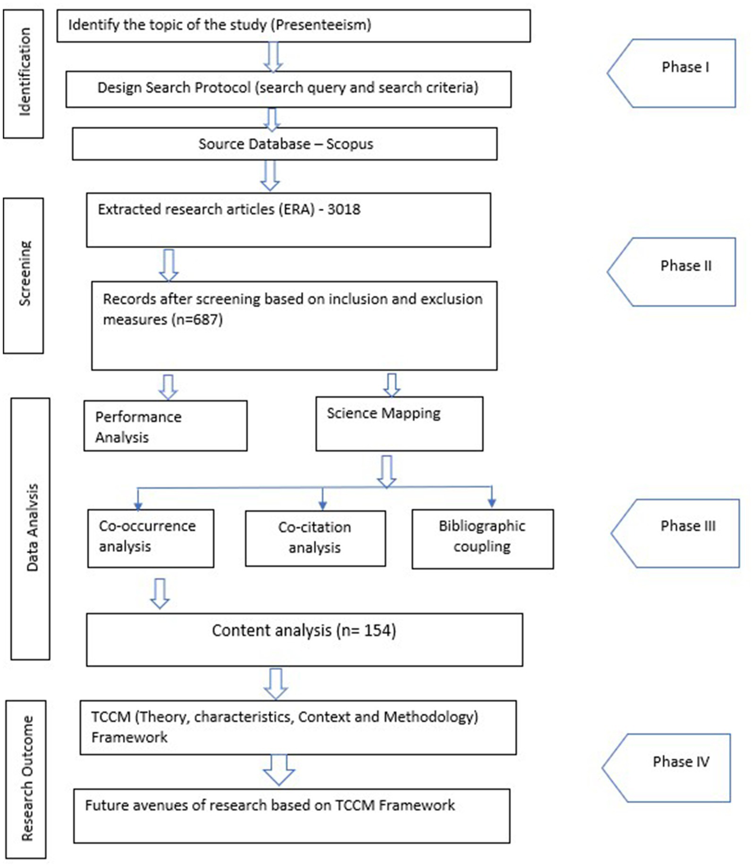 Presenteeism-focused research mapping in the workplace was based on data extracted from the Scopus Database. The researchers considered Scopus the data source to ensure methodical reliability and inclusivity. A bibliometric review followed the guidelines (Massaro et al., 2016). A bibliometric review is an in-depth examination of published scientific literature in a field or research area. The statistical methods employed for the bibliometric analysis of presenteeism research encompass two primary procedures: Performance analysis and science mapping. Performance analysis focuses on publications’ volume and growth trajectory over time, including identifying prolific authors, affiliated institutions, countries, and sources. Science mapping utilizes bibliometric methods to determine the structure of a research area by grouping documents, authors, journals, and words. For science mapping, three types of analysis were conducted using VOS viewer software: co-occurrence network, bibliographic coupling, and co-citation network. Additionally, two types of analysis were performed using R-studio software: country collaboration map and thematic map. These bibliometric networks were constructed to visualize collaboration patterns and the conceptual structure of scientific research on presenteeism. The bibliographic coupling determines the relevance of research articles based on the frequency of shared-cited references. Bibliographic coupling works with the extracted research papers from the Scopus database, whereas co-citation analysis works with cited references. The researchers used content analysis in this study to gain a better understanding of concepts and recent findings. Content analysis is making “sense out of text data, divide it into text or image segments, label the segments with codes, examine codes for overlap and redundancy, and collapse these codes into broad themes.” Because bibliometric reviews alone do not grab the interest of young scholars due to their emphasis on citations, TCCM (Theory, Characteristics, Context, and Methodology) analysis can overcome this constraint (Sharma et al., 2020). As a result, this study also used the TCCM framework to extract the essence of recently published publications and incorporate the work of renowned scholars, in particular those who have more citations.