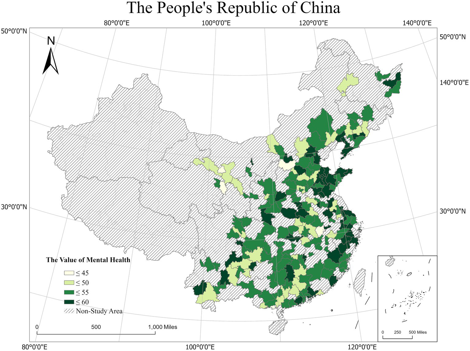 Previous research has extensively examined the impact mechanisms affecting mental health across various multidisciplinary fields, including sociology, psychology and geography. This has included investigating the driving factors, methods, and differences associated with mental health. First, studies on driving forces have mainly focused on environments (e.g., social, built, and work environments) (Lin and Yang, 2015; Silva et al., 2016; Shen et al., 2021) and perceptions (e.g., subjective environmental perception and satisfaction) (Mehrabian and Russell, 1974; Liu et al., 2019a). Similarly, certain researchers have endeavored to investigate different methods for measuring mental health and implementing new technologies (Cuijpers et al., 2009; Liu et al., 2021). Furthermore, research interest has been drawn to the examination of mental health disparities, encompassing distinctions between urban and rural areas and sex-based disparities (Shen et al., 2021). Although existing research has drawn some important conclusions regarding the impact mechanism of mental health, significant gaps remain. Prior research of mental health has mainly focused on specific groups, such as the elderly or the migrants, and has limited exploration of the feature of geographical spatial distribution. Thus, this study examines the spatial correlation and influencing mechanisms affecting residents’ mental health in different regions of China, based on large-scale population data obtained from the China Labor-force Dynamic Survey (CLDS). A variety of influencing factors of objective environment and subjective perception were employed, including the built environment, work environment, and economic satisfaction, etc. Furthermore, the analysis also considered the comprehensive effects of random groups, as well as the varying effects on migrants and local residents. The findings of this study will serve as a valuable resource for urban planners and decision makers, contributing to the enhancement of mental health among urban residents and helping to enable the further progress of cities in China.