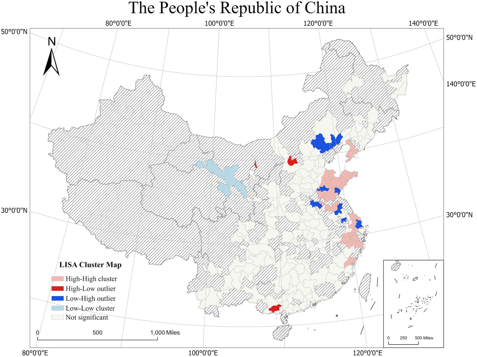 To explore the spatial differentiation and autocorrelation characteristics of mental health in city scale, Global Moran’s I (Moran, 1950) and Local Moran’s I (Anselin, 1995) were implemented. The Moran ‘s I index was 0.103 with a Z-score of 4.162 and a value of p <0.01, indicating that the mental health in study area has a positive correlation. As shown in Figure 3, we further explored the spatial differentiation characteristics of mental health using Local Indicators of Spatial Association (LISA) clustering at the city scale in the study area. The results of the LISA clustering significance test showed that, first, eastern regions, for example, cities in Shandong province, Hangzhou, Suzhou, Nantong in Yangtze River Delta and Dalian, Yingkou in Liaodong Peninsula generally showed a positive local spatial correlation with mental health and belonged to high-high clustering areas. This indicates that the mental health scores of the residents in and surrounding cities were higher overall, and they may generally have a better mental health status. Second, cities such as Shanghai, Chengde, Zhengjiang and Huai’an are low-high clustering areas, indicating that people living in those areas may have worse mental health status than surrounding cities. The high-low clustering areas including Shuozhou and Qinzhou, indicating that the mental health scores in these areas were higher than those in the surrounding areas. Low-low aggregation areas mainly included in cities in Gansu and Qinghai provinces such as Wuwei, Zhangye and Xining, indicating that the residents in these areas have relatively poor mental health.