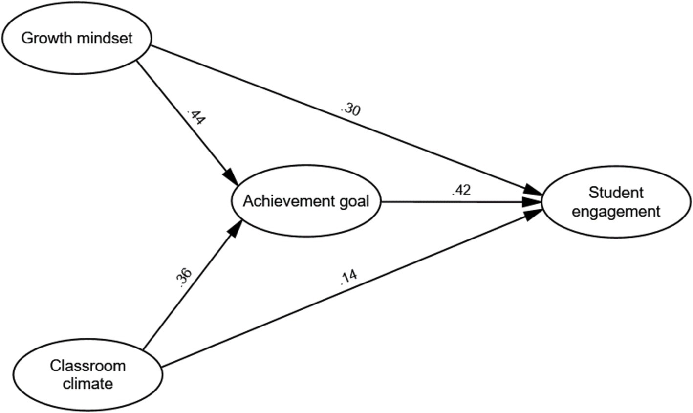The SEM analysis revealed significant positive correlations among classroom climate, growth mindset, achievement goal orientation, and student engagement. Both classroom climate and growth mindset were found to directly and positively predict student engagement. Additionally, achievement goal orientation mediated the relationships between both classroom climate and student engagement, and between growth mindset and student engagement.