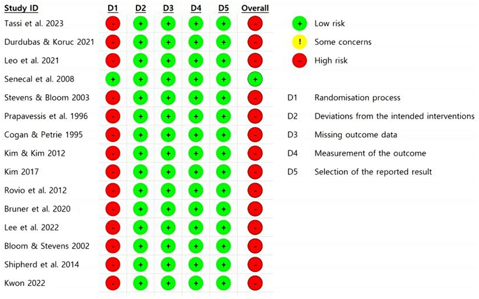 Figure 2 provides a visual representation of risk of bias evaluations for each domain of the Cochrane Risk of Bias tool. Out of all included articles, 1 article (6.7%) had a low overall risk of bias, while 14 articles (93.3%) exhibited a high overall risk of bias. However, except for the randomization process domain, the other four checklist items showed low risk across all 15 articles.