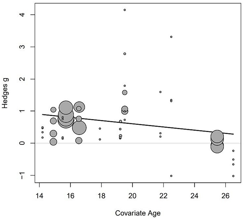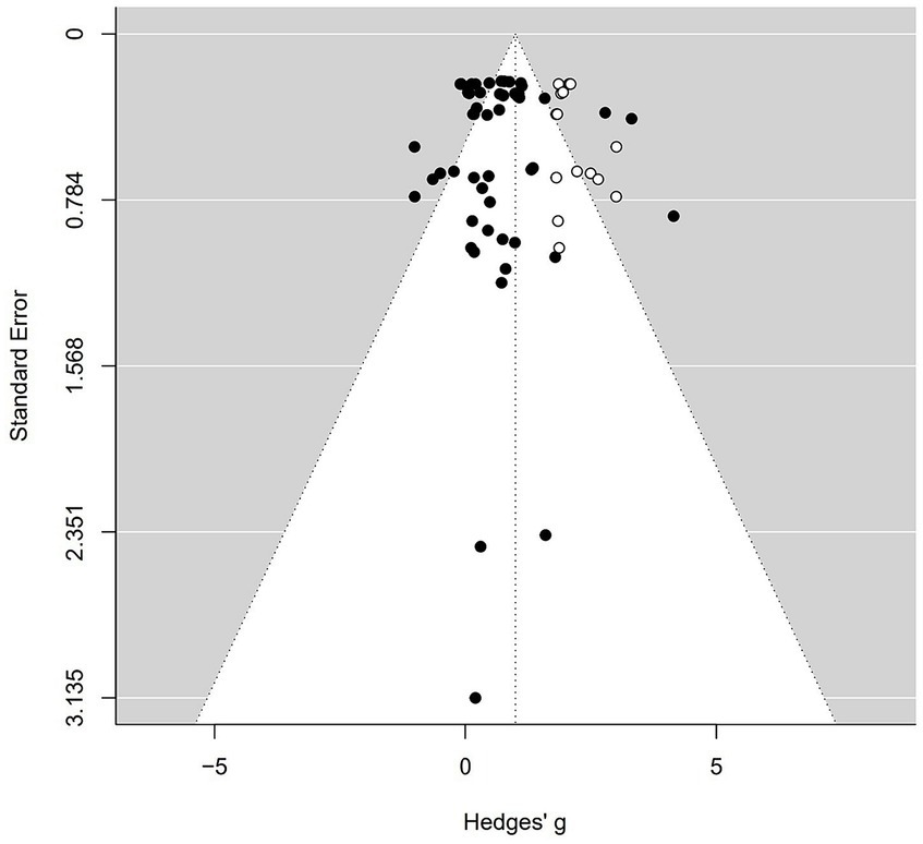 To assess the potential presence of publication bias in our meta-analysis of team-building intervention on cohesion, we utilized a funnel plot for visual examination, as illustrated in Figure 4. In an ideal scenario without publication bias, data points (depicted as solid circles) from individual case studies would exhibit a symmetrical distribution. Any deviation from this symmetry suggests the potential presence of publication bias. As seen in Figure 4, the distribution of effect sizes is slightly left–skewed.