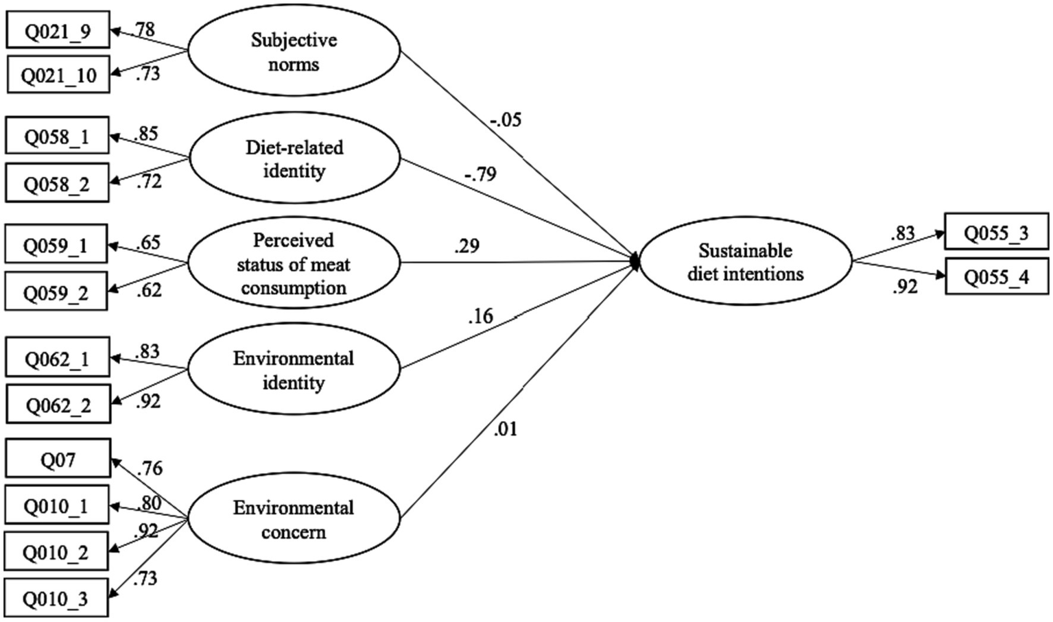 Sustainable diet intentions was the sole dependent variable and measured participants willingness to engage in different sustainable diet behaviors. Social norms included two items measuring descriptive social norms (Q021_7 and Q021_8), how common a person perceives a behavior to be, and two items measuring injunctive social norms (Q021_9 and Q021_10), the expected rewards, or approval, of a behavior (Cialdini et al., 1990; Thøgersen, 2006). Injunctive social norms will here be referred to as subjective norms, in line with the terminology of the TPB (Ajzen, 1991). Perceived behavioral control related to the level of control a person believes they have over engaging in sustainable diet behaviors. Diet-related identity refers to how central a person’s eating behaviors, specifically meat-eating, are to their self-identity. Perceived status of meat consumption measured the perceived level of approval or status associated with certain diets within society. Environmental identity refers to how central a person’s concern for the environment is to their self-identity. Environmental concern measured the level of concern a person feels about the threat of climate change.